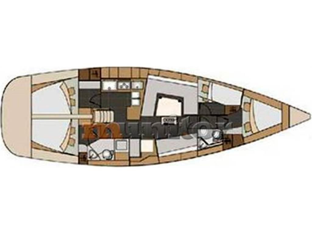 Salone, Cucina, Cabina di prua, Cabina laterale, 2 cabine di poppa, 2 bagni, 2 WC, Pozzetto