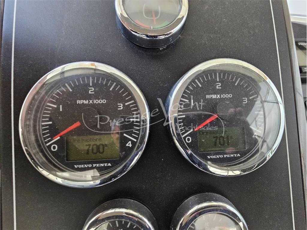 Allarme motore, Autogonfiabile, 04 Batterie, Caricabatterie, Doccia esterna, Elica di prua, Flap idraulici, Impianto antincendio, Indicatori flaps, Luci di cortesia, Piattaforma, 02 Pompa di sentina automatica, Pompa di sentina manuale, Porta di ingresso, Pozzetto in teak, Presa 220V banchina, Rollbar, Salpa ancora elettrico, Scaletta da bagno, Tavolo in pozzetto (a sollevamento idraulico), Tromba Cucina, Frigorifero esterno Boiler, Impianto acque nere, Prese interne 12V, Prese interne 220V, Wc marino elettrico Altoparlanti, Stereo (Fusion) Angolo barra, Bussola, Comando motori elettronico, Contametri catena, Contamiglia, Ecoscandaglio, GPS, Plotter, Radio VHF Bimini, Cuscineria di poppa, Cuscineria di prua, Cuscineria pozzetto, Telo copri consolle, Tendalino (poppa)
