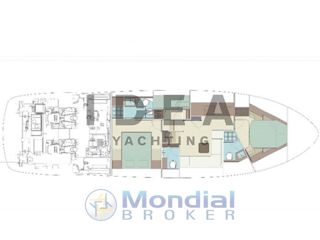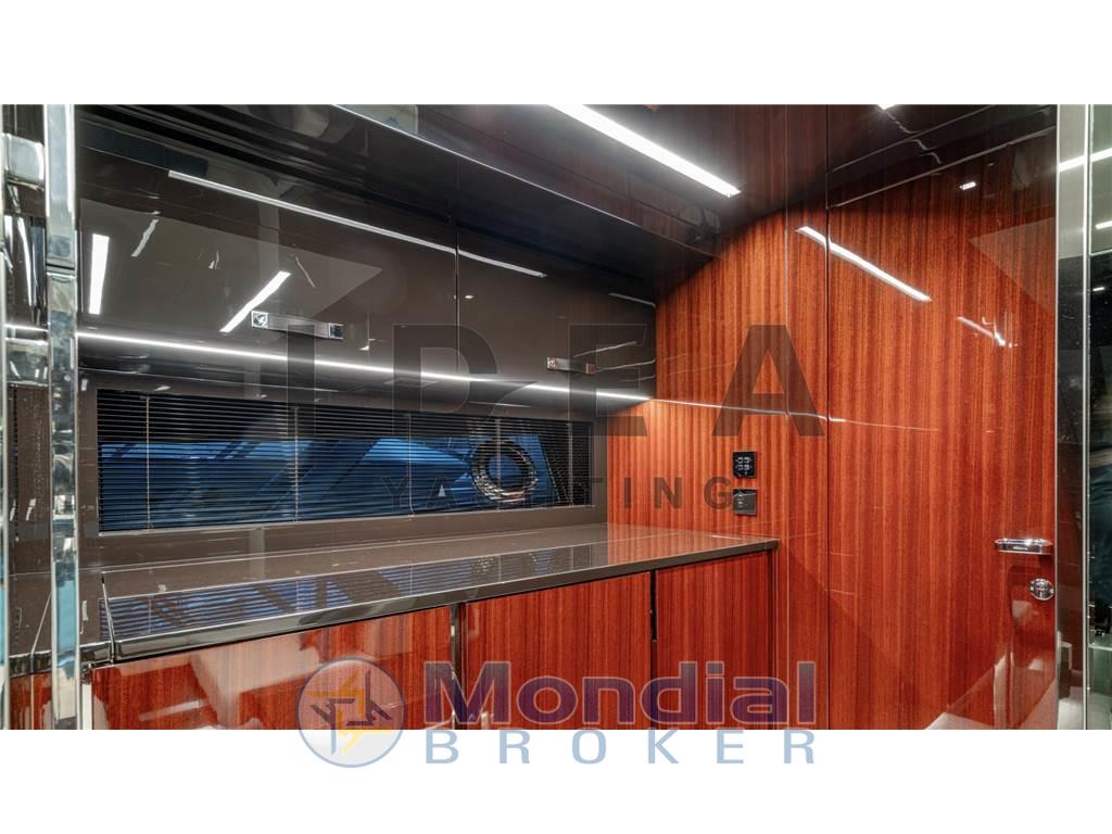 Ancora, Auto Dynamic Trim Interceptor (Humphree), Camminamenti laterali in teak, Elica di poppa - stern thruster, Elica di prua - bow thruster, Garage per tender, Pompa di sentina elettrica, Ponte in teak, Pozzetto Teak, Stabilizzatori (Seakeeper), Tromba.