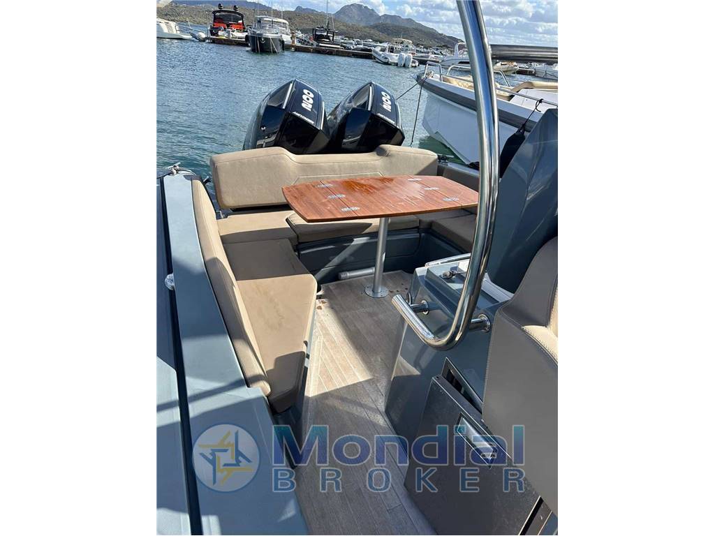 versione Storm con scafo e coperta grigio scuro, consolle e musone in VTR nero, tubolari military grey con bottazzo nero, dettagli carbon, cuscineria completa in cellula chiusa, colore Silvertex Toupe, T-top in acciaio con tenda parasole nere, cockpit bar con lavello e frigo da 42 lt in inox, tavolo pozzetto in teak convertibile in prendisole, coperture complete per consolle e sedute