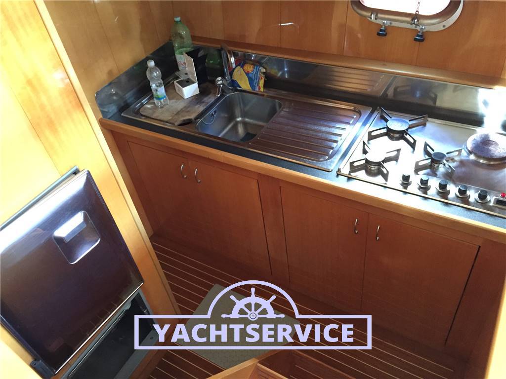 Layout con 3 cabine, di cui una matrimoniale a prua con bagno, una con 2 letti singoli in piano, cabina con 2 letti a castello, secondo bagno con doccia + cabina marinaio con wc. Cucina con piano cottura a gas, lavello e 2 frigoriferi