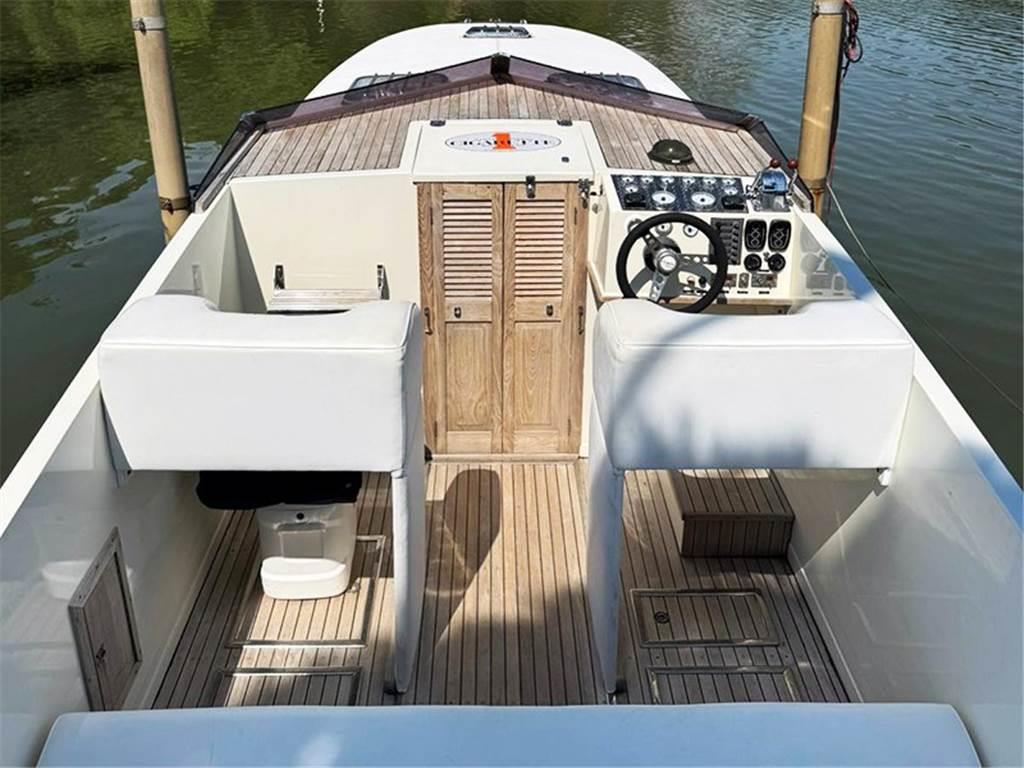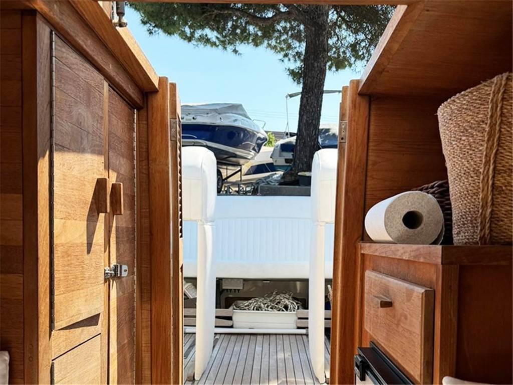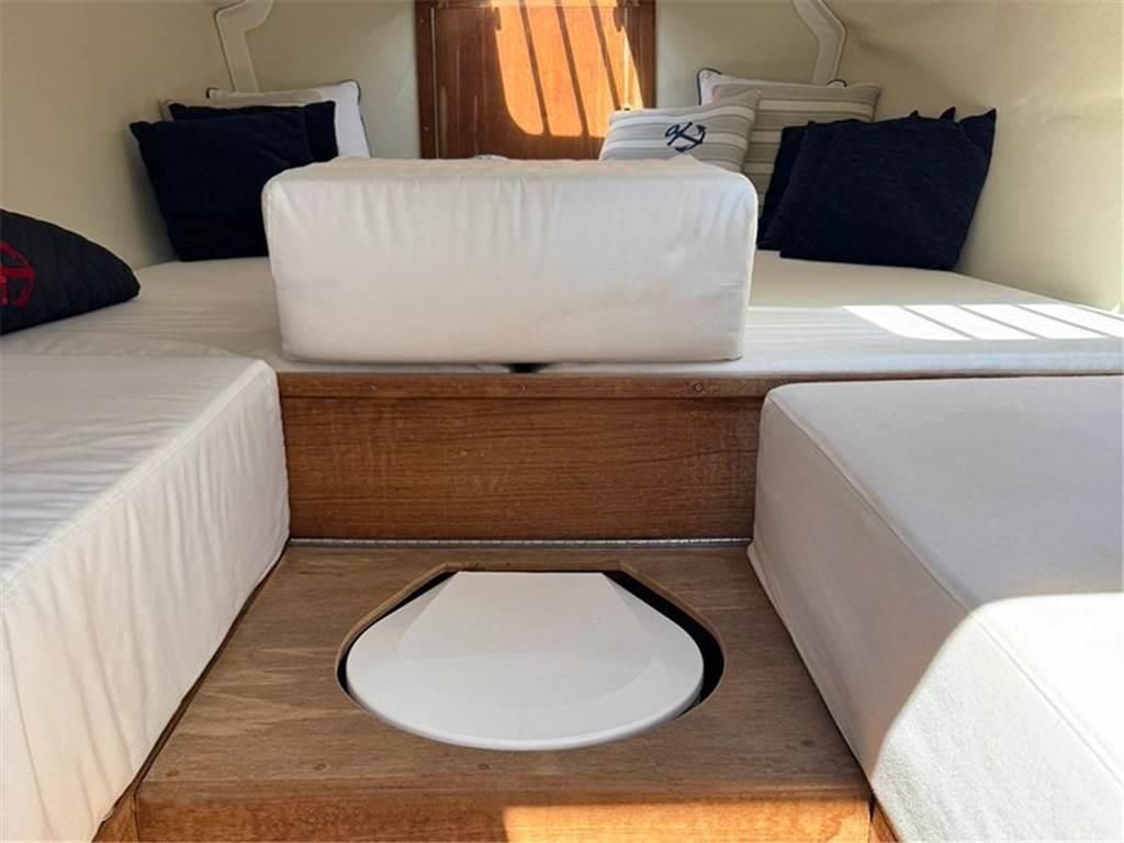 Attraverso la plancetta in teak si accede al prendisole poppiero che nasconde il gavone motore. Il pozzetto è attrezzato divanetto posto per madiere, seduta del pilota lungo la murata di dritta e quella del copilota sul lato opposto.