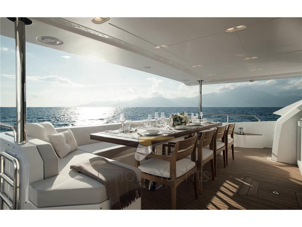 Camminamenti laterali in teak, Elica di poppa - stern thruster, Elica di prua - bow thruster, Flap idraulici, Garage per tender, Hard top, Impianto antincendio, Indicatori Flaps, Lavaggio catena, Luci di cortesia, Luci subacquee, Pompa Lavaggio Ponte, Ponte in teak, 2 Porta laterale, Pozzetto Teak, Presa acqua banchina, Stabilizzatori, Tavolo pozzetto, Tender (Williams 445 DieselJet), Winch tonneggio di poppa, Winch tonneggio di prua.