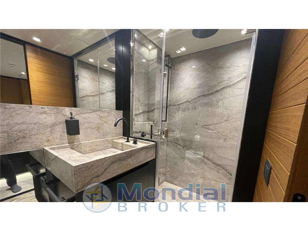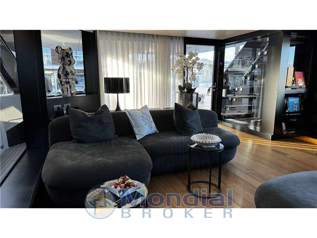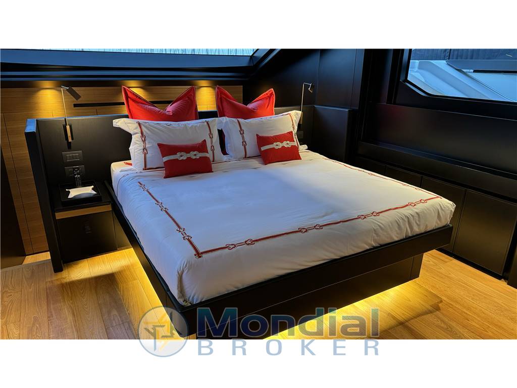 The master suite, located on the main deck forward, has direct access to the foredeck which becomes an extension of the Owner's private apartment. In addition to the master, this yacht comes with 3 staterooms on the lower deck, including a second beam-wide master, and each with its own en-suite bathrooms in Arabesco marble, + 1 extra convertible cabin to accommodate a total of 9 guests on board, double crew cabin with private bathrooms, marble in bathrooms, extensive HiP entertainment system, Boffi Design kitchen