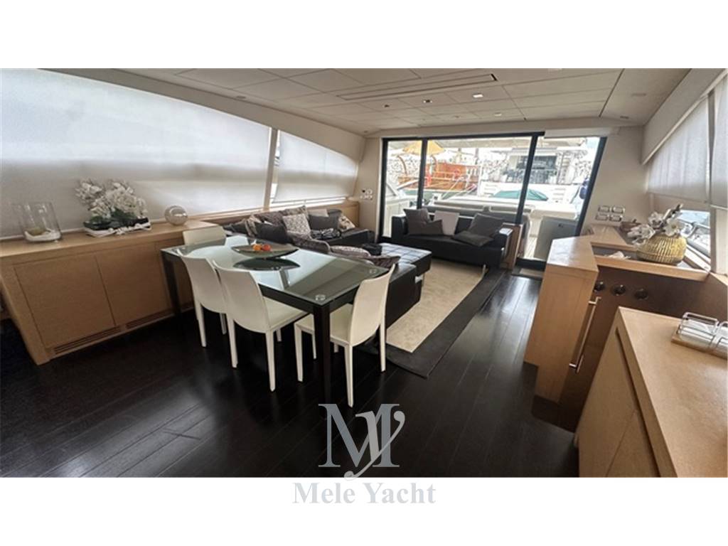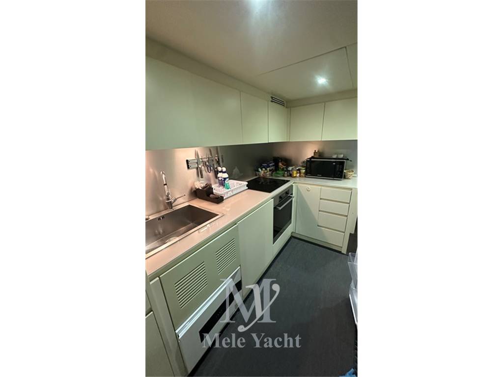 - zona equipaggio comprendente la cucina con piano cottura a induzione Bosch, forno combinato Miele, frigorifero Samsung con congelatore ed icemaker, dinette servizio con sistema tvcc, Tv LG smart + lettore cd / mp3 + cordless Gigaset + Sky decoder, lavastoviglie e lavasciuga Beko/Samsung, abbattitore alimenti;