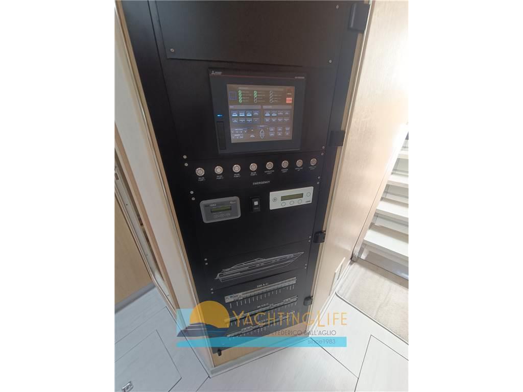 Allarme motore, Allarme sentina, Ancora, Angolo barra, Apertura Vano Motore Elettrica, Autoclave, Autogonfiabile, Batterie, Bussola, Camminamenti laterali in teak, Caricabatterie, Contamiglia, Doccia esterna, Ecoscandaglio, Elica di prua - bow thruster, Flap idraulici, 2 GPS, Impianto antincendio, Indicatori Flaps, Luci di cortesia, Passerella (idraulica), Piattaforma (idraulica), Pilota automatico, Pompa di sentina automatica, Pompa di sentina manuale, Pozzetto Teak, Presa 220V banchina, Raddrizzatore, Radio VHF, Salpa Ancore Elettrico, Scaletta da bagno, Tavolo pozzetto, Tromba, Winch tonneggio di poppa