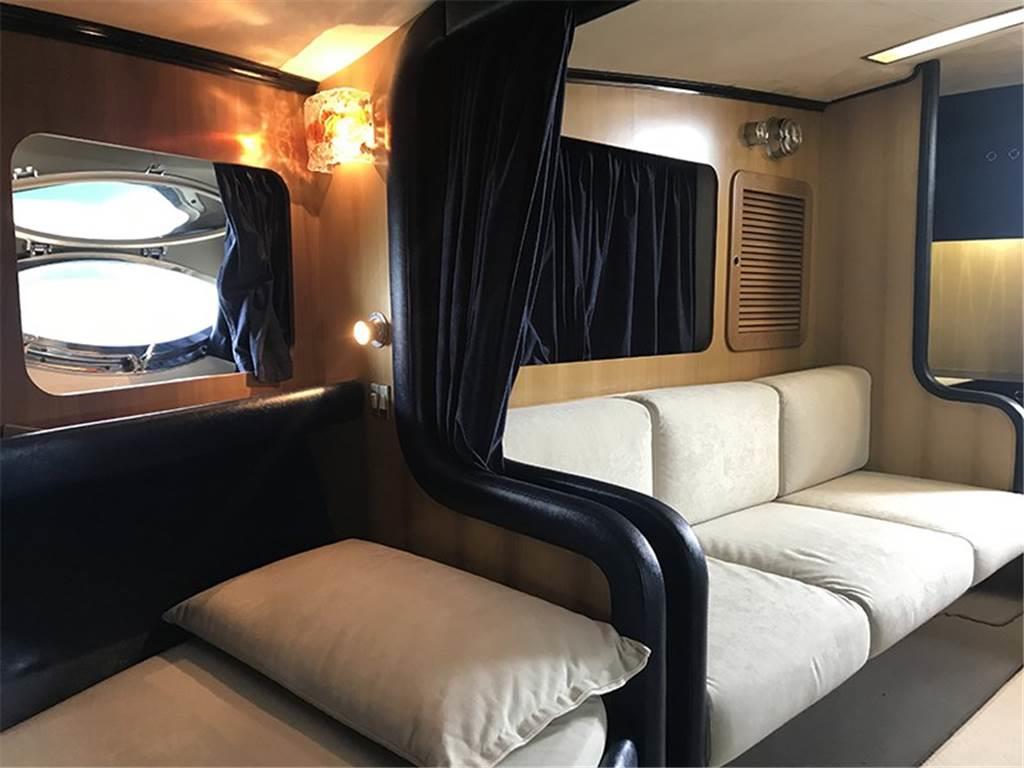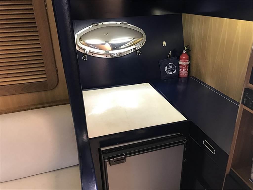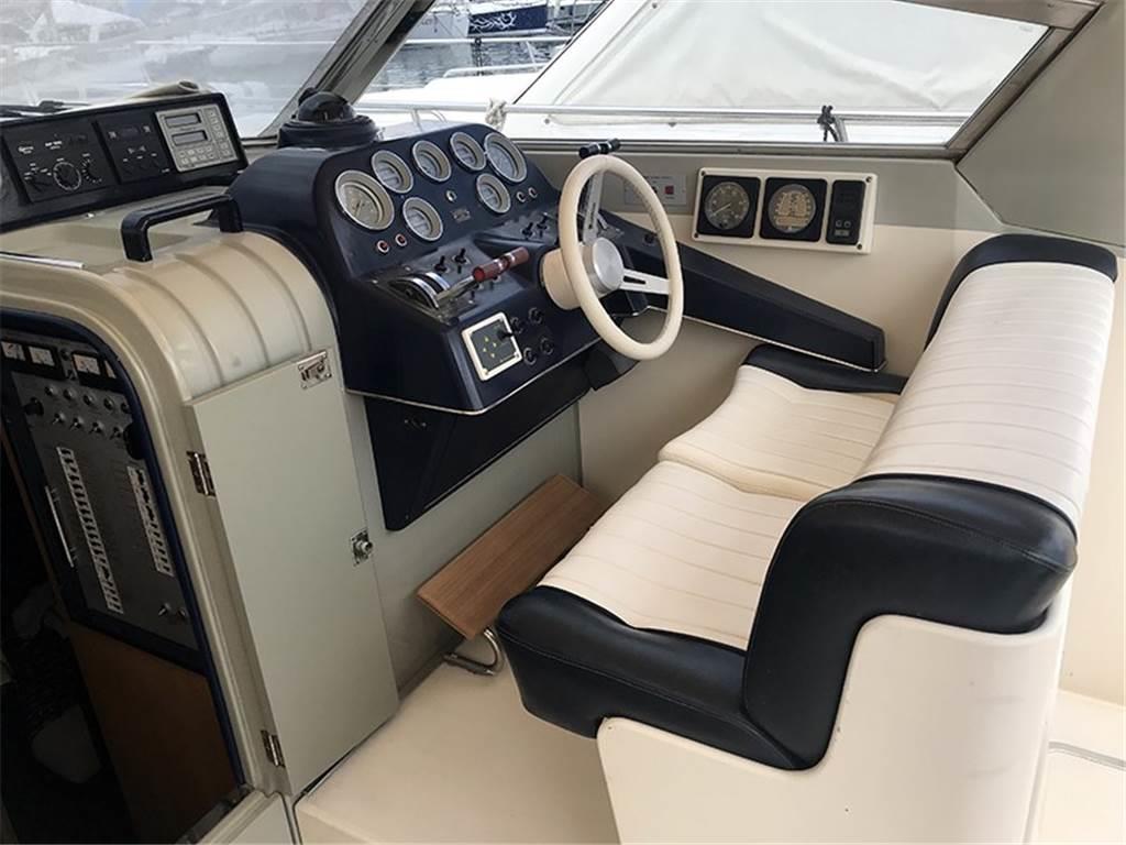 Coperta: ampio pozzetto prendisole di poppa, postazione di pilotaggio a dritta e sedile passeggeri a sinistra. Prendisole di prua. Cuscinerie e tappezzerie interne ed esterne in perfette condizioni. Sottocoperta: cucina attrezzata, bagno privato con doccia e wc elettrico. Cabina open space con 4 posti letto.