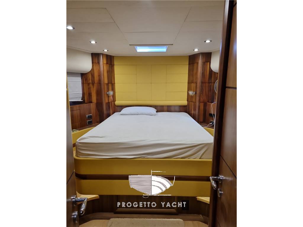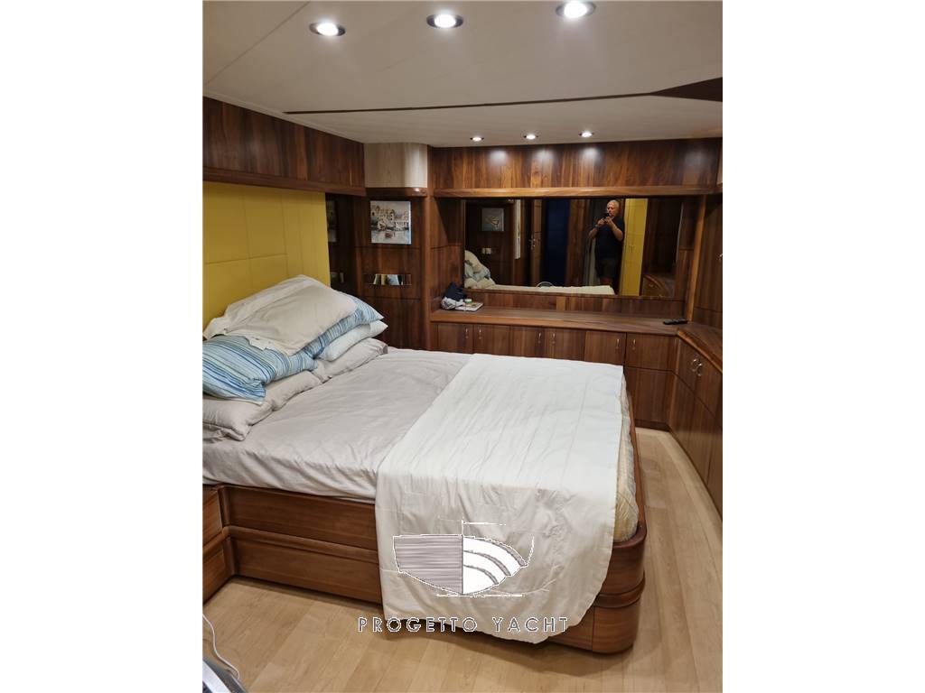 Cabina armatore centro barca con bagno dedicato, cabina vip a prua con bagno, cabina ospiti a 2 letti affiancati con bagno, cabina singola con bagno. Cabina equipaggio con bagno con accesso dallo specchio di poppa. Pavimenti in parquet