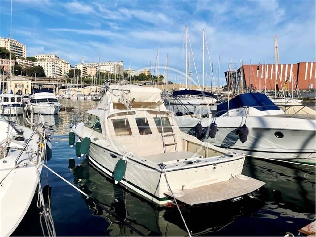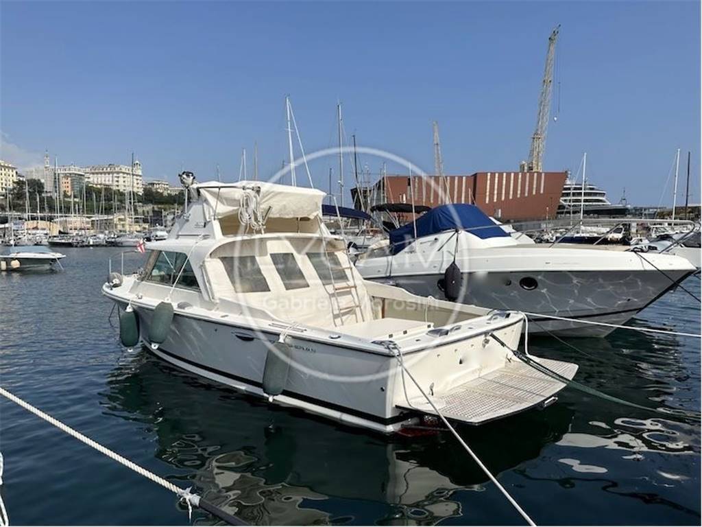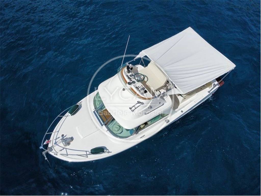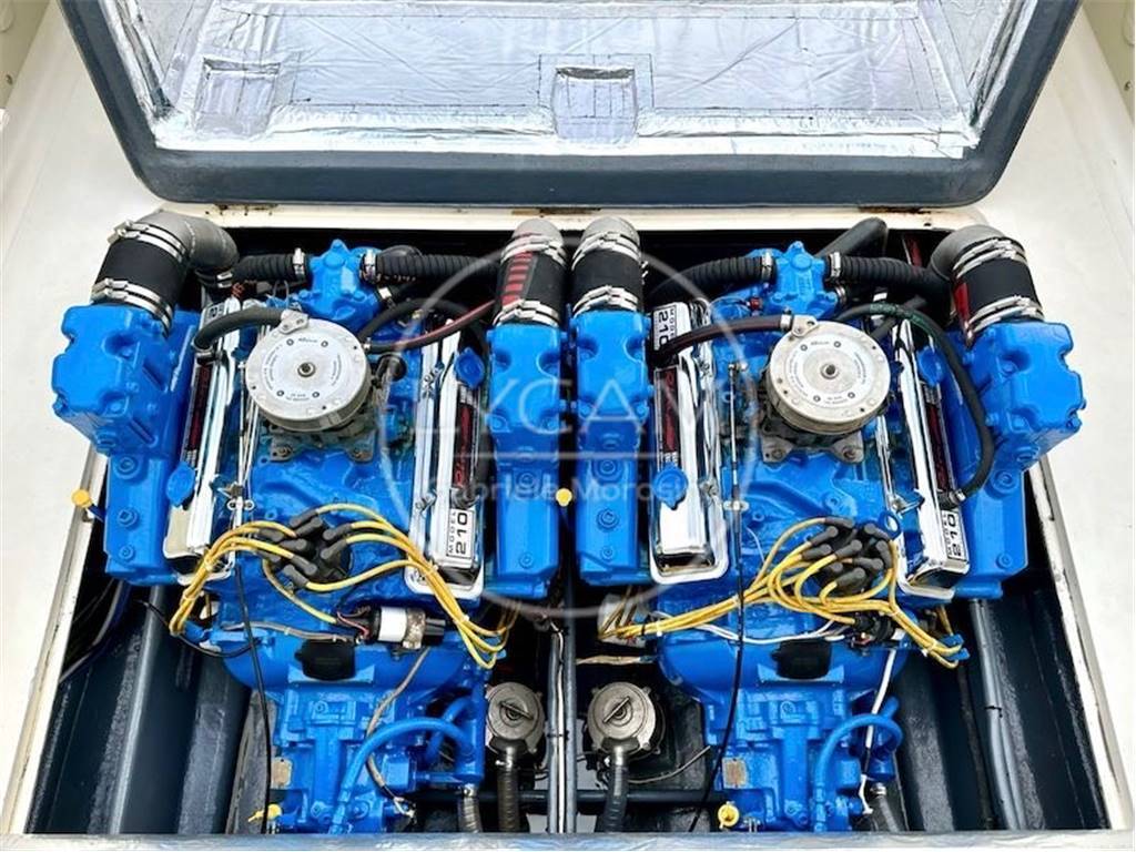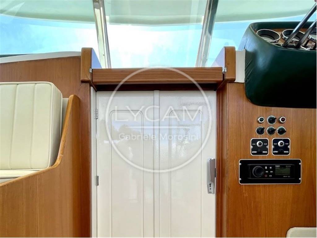 Cabina con due cuccette, un armadio per lato e un w.c. fra le due cuccette. Flying bridge accessibile per mezzo di scaletta metallica con gradini in teak posta a dritta con divanetto due posti e stazione di governo. Pozzetto con prendisole, mobile bar con frigorifero e lavabo e la plancia di comando a dritta, a sinistra dinette con divani e tavolo trasformabili in letto.