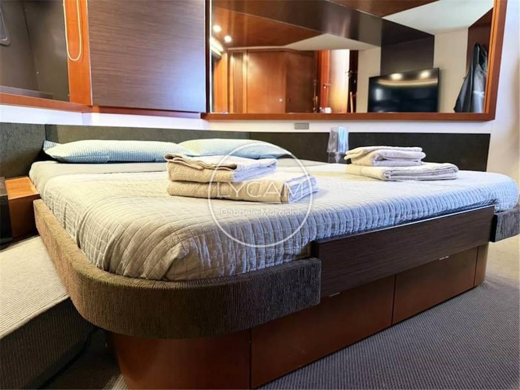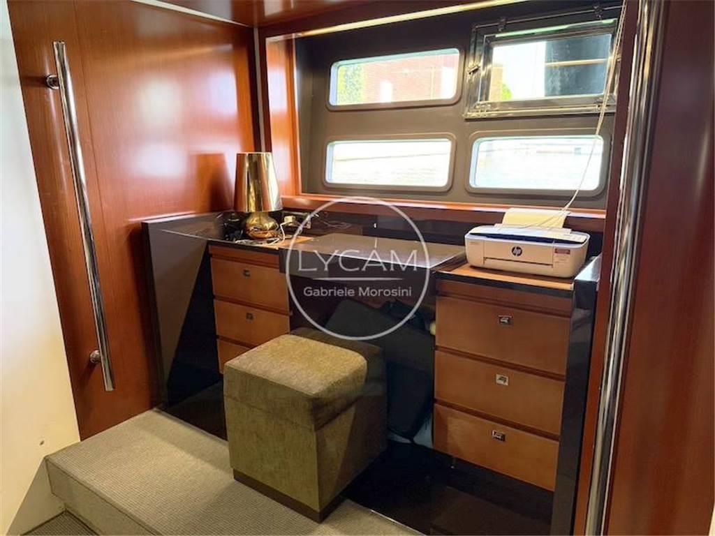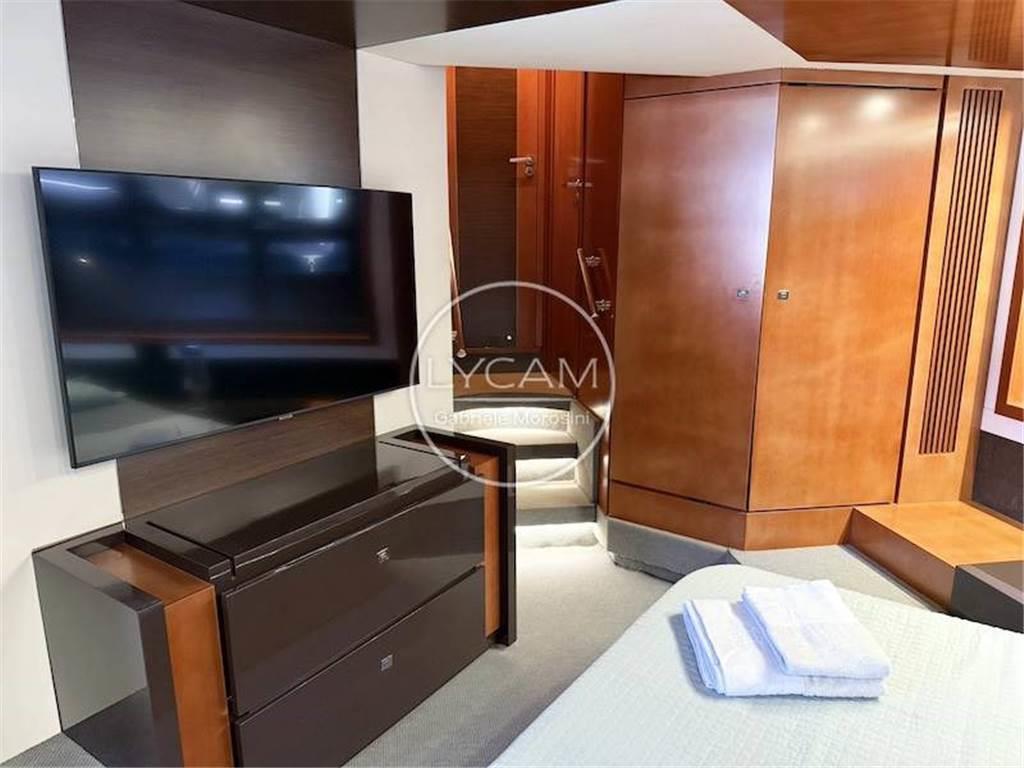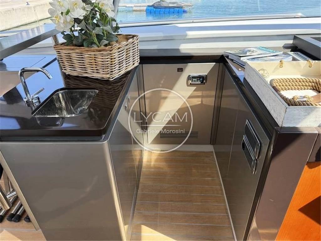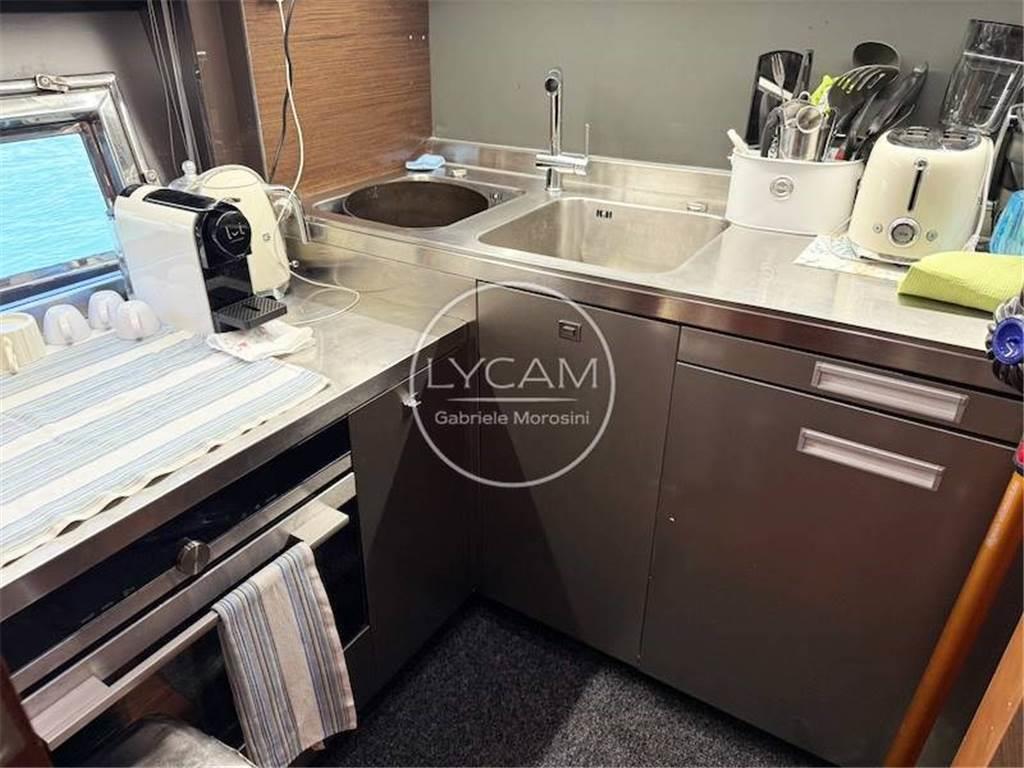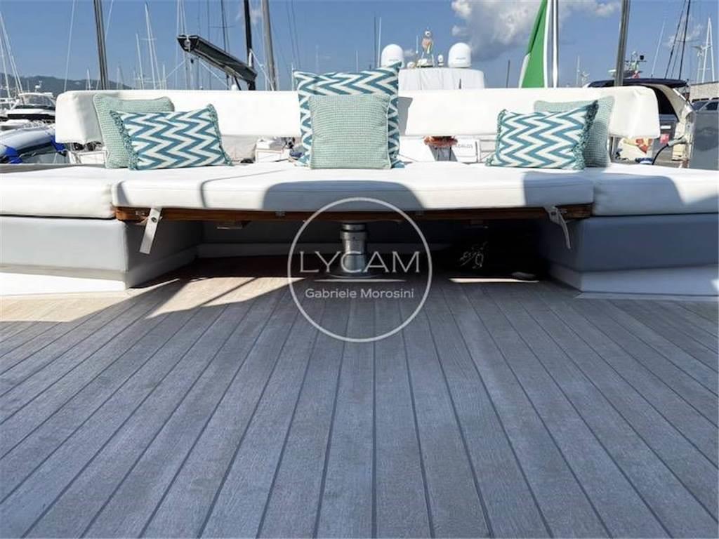 Luci di navigazione; Luce di fonda; Luci subacquee; Ancora; Catena; Tergicristalli; Sirena; Scaletta bagno; Doccia pozzetto; Teak pozzetto; Passerella idraulica; Asta portabandiera; Teak plancetta; Frigo pozzetto; Ice maker pozzetto Isotherm; Lavello cucina pozzetto; Cuscinerie pozzetto; Tavolo pozzetto; Cuscinerie prendisole prodiero; Verricello elettrico; Bitte ormeggio; Winch tonneggio poppa; Altoparlanti pozzetto; Tenda poppiera; Generatore Mase 17 Kw; Batterie; Stacca-batterie; Parallelo; Presa 220V; Aria condizionata; Flaps; Bow Thruster; Tender con motore fuoribordo 25 CV; RINA 05/25; Frigo interno; Forno; Lavastoviglie Miele; Fuochi ad induzione; Freezer; TV; Serbatoio acque grigie; Serbatoio acque nere; Lavatrice LG