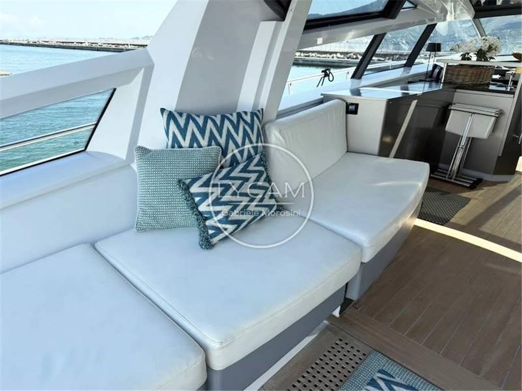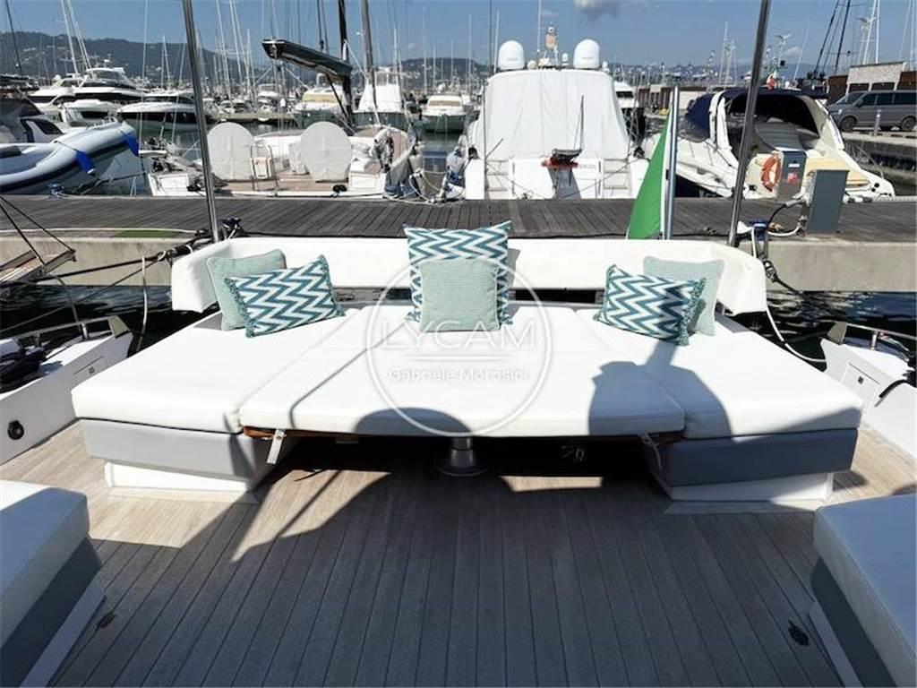 Attraverso l’ampia plancetta di poppa si accede al ponte di coperta che appare come un unico grande ambiente grazie alla vetrata panoramica apribile che divide quindi interno ed esterno. A poppa vi è un comodo divano a U convertibile a prendisole e protetto da una tenda. Procedendo verso prua si trovano 2 divani posti per murata e, a seguire, la dinette sul lato di dritta e il mobile bar/cucina sulla sinistra.