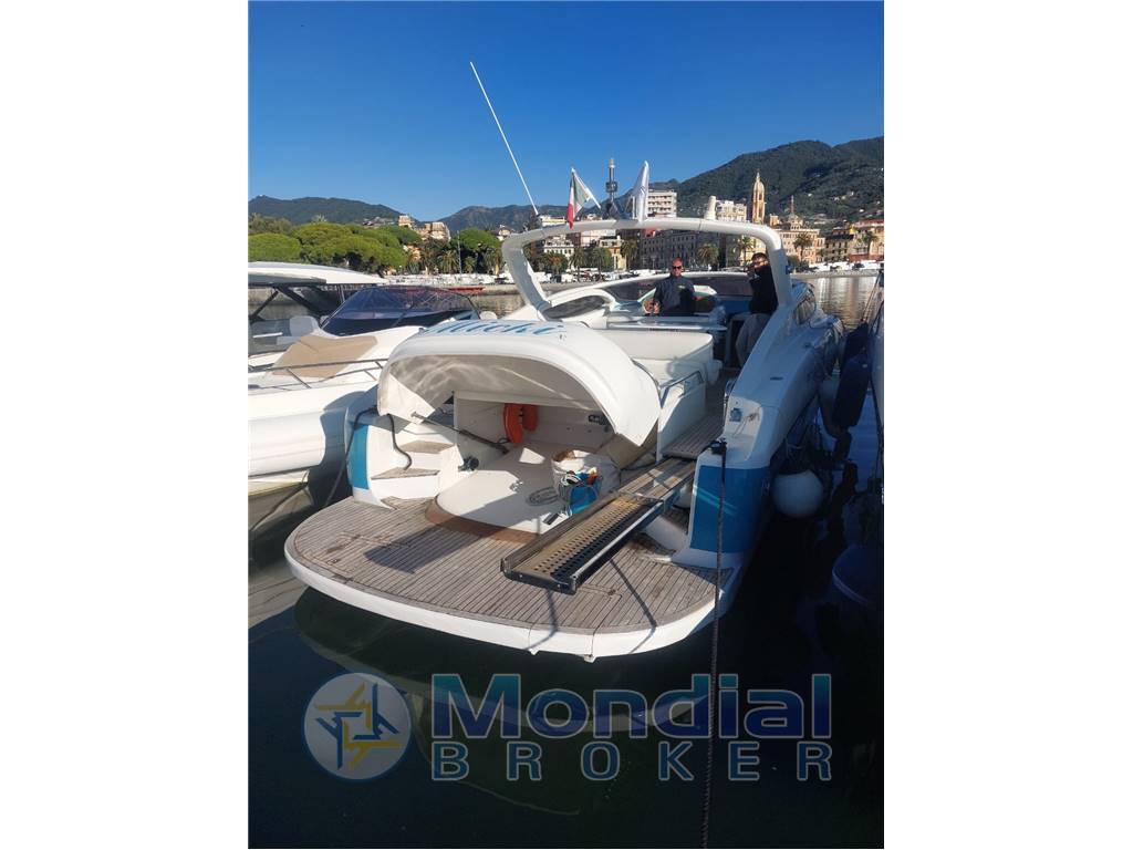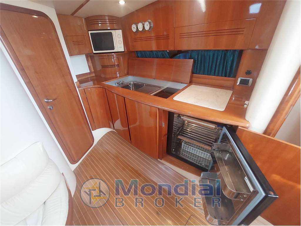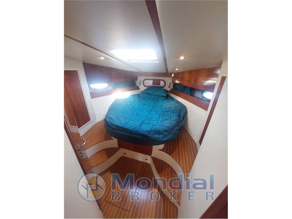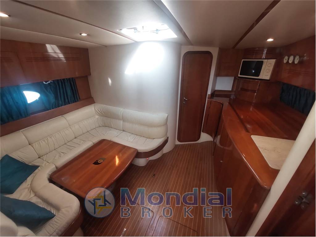 Motorizzazione con piedi poppieri, prestazioni brillanti: crociera a 28 nodi, velocità massima oltre i 35. Manovrabilità precisa, consumi contenuti. Interni luminosi e ben rifiniti: cabina armatoriale a prua con letto matrimoniale e bagno dedicato con box doccia; cabina ospiti doppia a poppa sinistra; secondo bagno completo a poppa dritta, accessibile dalla dinette. Zona giorno con cucina attrezzata (piano cottura, lavello inox, frigorifero, microonde) e divano a L con tavolo regolabile. Pavimentazione in teak, impianti ordinati, atmosfera calda e funzionale.