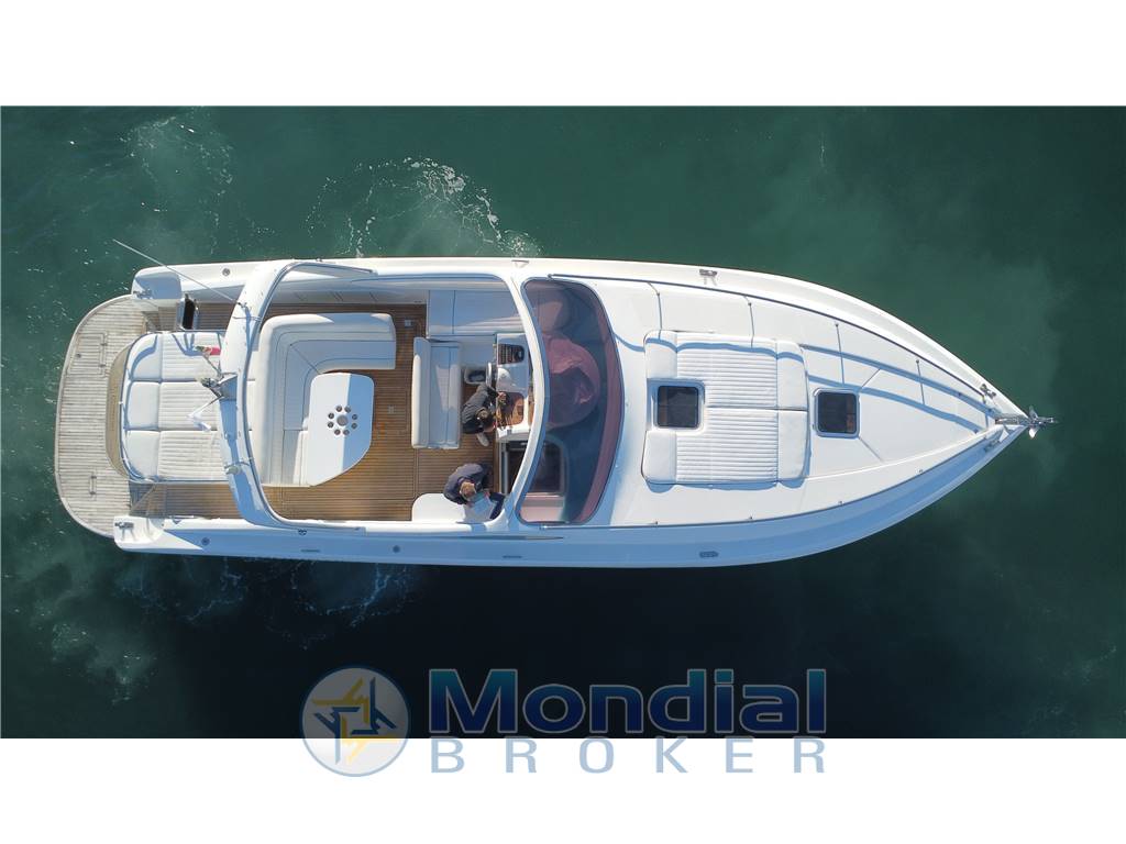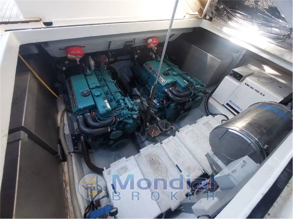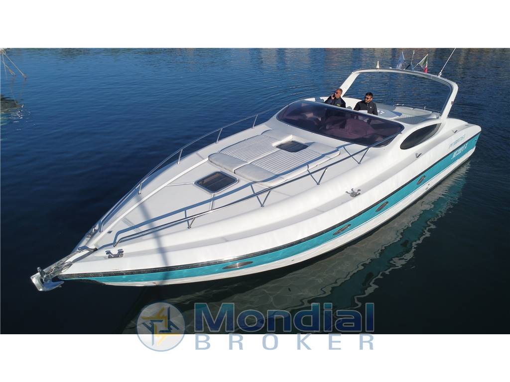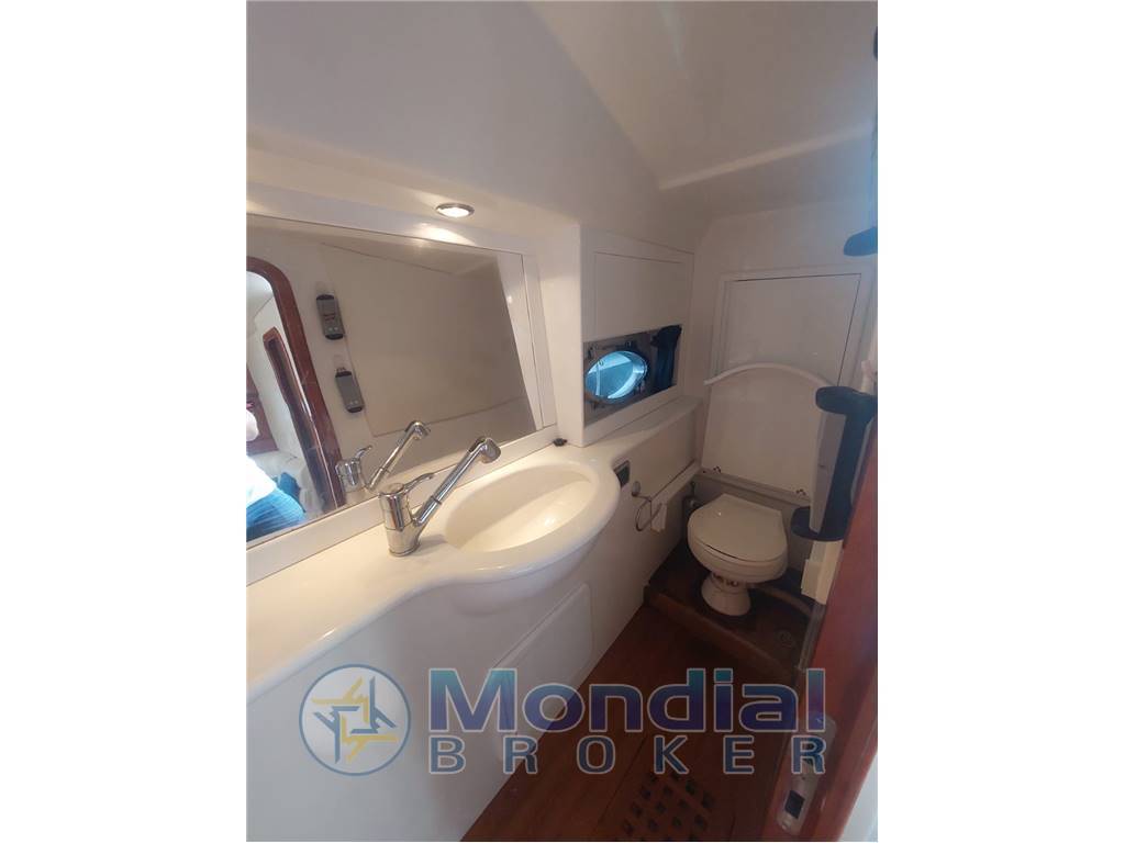 Motorizzazione con piedi poppieri, prestazioni brillanti: crociera a 28 nodi, velocità massima oltre i 35. Manovrabilità precisa, consumi contenuti. Interni luminosi e ben rifiniti: cabina armatoriale a prua con letto matrimoniale e bagno dedicato con box doccia; cabina ospiti doppia a poppa sinistra; secondo bagno completo a poppa dritta, accessibile dalla dinette. Zona giorno con cucina attrezzata (piano cottura, lavello inox, frigorifero, microonde) e divano a L con tavolo regolabile. Pavimentazione in teak, impianti ordinati, atmosfera calda e funzionale.