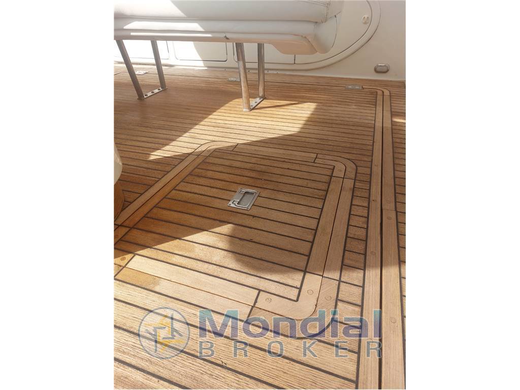 Divisione interna – Primatist G43 “Michi SX” Gli interni sono rifiniti in legno chiaro e pelle, con ottima altezza e luminosità naturale. A prua, cabina armatoriale con letto matrimoniale centrale, armadiature e bagno dedicato completo di box doccia. La zona giorno è organizzata con cucina attrezzata a dritta (piano cottura, lavello inox, frigorifero, microonde), e divano a L con tavolo regolabile in altezza a sinistra. A poppa sinistra, cabina ospiti doppia con letti in piano e spazi contenitivi. A poppa dritta, secondo bagno completo, accessibile dalla dinette. Pavimentazione in teak, impianti ordinati, atmosfera calda e funzionale.