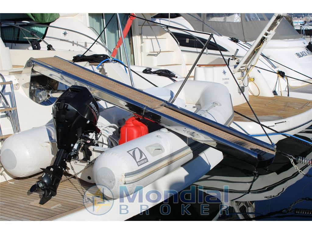 Allarme motore, Allarme sentina, Ancora, Angolo barra, 2 Antenna radar, Autoclave, 4 Batterie, Bussola, Camminamenti laterali in teak, 3 Caricabatterie, Contametri catena, Contamiglia, Doccia esterna, Doppia timoneria, Ecoscandagli, Elica di prua - bow thruster, Flap elettrici, Impianto antincendio, Passerella (BESENZONI), Piattaforma, Pilota automatico, Plotter, Plotter con antenna GPS, 3 Pompa di sentina automatica, 3 Pompa di sentina elettrica, Porta ingresso, Presa 220V banchina, Presa acqua banchina, Radar, Radio VHF, Salpa Ancore Elettrico, Scaletta da bagno, Tromba, Winch tonneggio di prua - Altoparlanti, Antenna Satellitare TV (RAYMARINE), Aria condizionata, Bimini, Boiler, Cucina, Cuscineria completa, Cuscineria di poppa, Cuscineria di prua, Cuscineria fly, Fornello (INDUZIONE), Frigorifero interno, Impianto acque nere, Impianto TV, 2 Prese interne 12v, 10 Prese interne 220v, Radio AM/FM, Serbatoio Acque Nere, Stereo, TV, 2 WC marino elettrico,