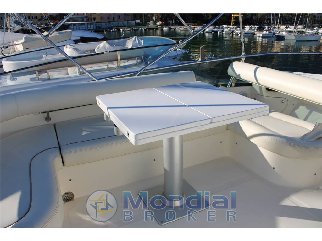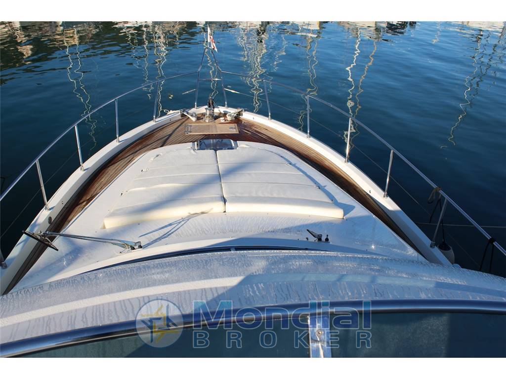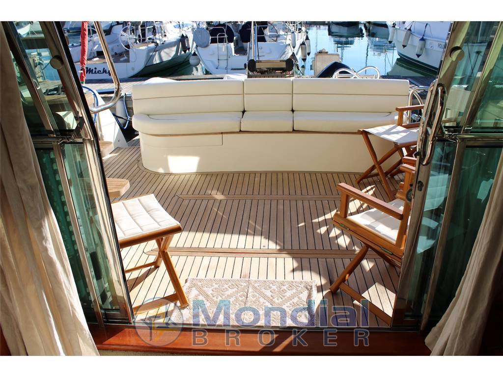 Solida costruzione in sandwich di vetroresina rinforzata, linea classica di Flybridge M/Y con ampie finestrature laterali al livello ponte principale; il pozzetto ampio, i passavanti comodi e continui, la plancetta a poppa, tutti impreziositi da finitura in doghe di teak massello. Il Flybridge offre comode sedute intorno ad un tavolo e prendisole oltre alla console di guida con strumenti di navigazione ripetuti: un bimini offre protezione dal sole se richiesto.