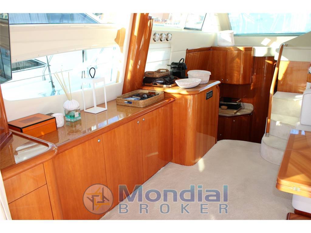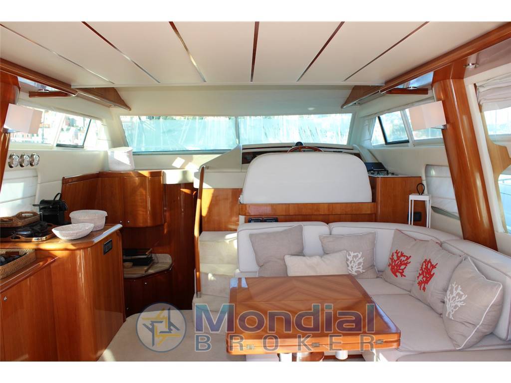 All’interno si trova una comoda dinette con divani, la zona pranzo con tavolo centrale, e la plancia principale di comando con strumentazione motori, utenze e di navigazione.
