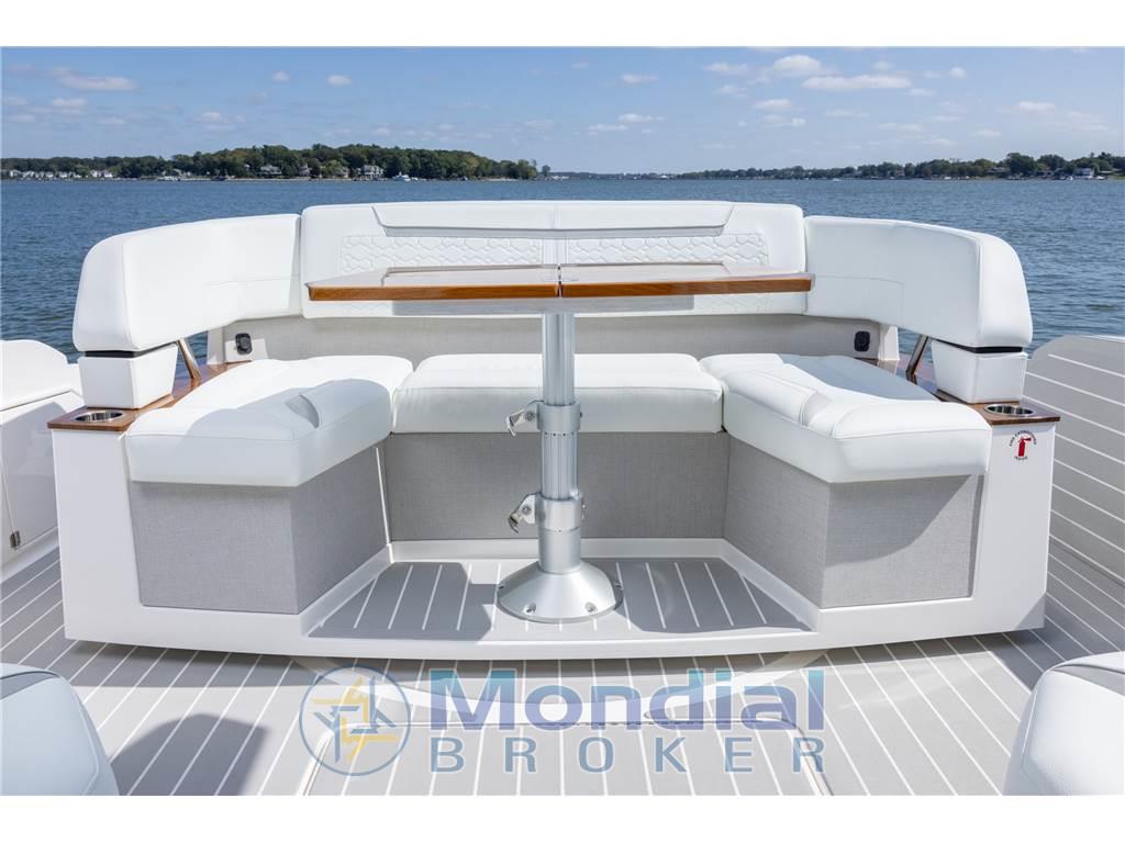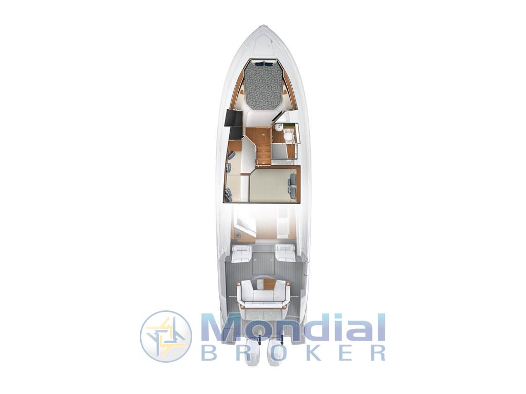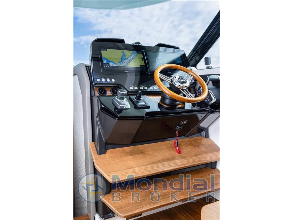 Il 43 LE offre raffinati comfort interni e un pozzetto di poppa aggiornato. Sottocoperta, una cabina armatoriale privata si trova a prua, mentre una cabina ospiti a centro cabina e un bagno privato caratterizzano lo spazio. L'atrio e i gradini conducono al piano superiore, dove si trova una cucina completamente attrezzata e centralizzata nel salone. Questo spazio è completato dal sedile trasformabile del compagno a babordo, che può essere regolato per ottenere ulteriori posti a sedere per la cena. La dinette si trasforma anche in una cuccetta. Una cabina in vetro con porta scorrevole in vetro e finestra in vetro ad azionamento elettrico si apre senza soluzione di continuità sul pozzetto, completo di terrazza a scafo ribaltabile. Scegliete tra il Buffet Lounge o il modulo Adventure per adattare il pozzetto alle vostre preferenze di navigazione. Il Buffet Lounge girevole è dotato di tavolo lucido, grill elettrico e piano d'appoggio, mentre il modulo Adventure comprende sedute lounge ribaltabili, serbatoio congelatore avvolto in bobina, pozzetto per il vivo e altri servizi per la pesca necessari per una giornata memorabile in acqua. Contattateci per ogni ulteriore dettaglio.