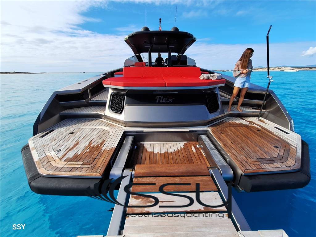 L'inconfondibile hardtop dello yacht offre un punto d'ombra sul ponte, dove ci si può rinfrescare dopo essersi goduti i raggi del sole sullo spazioso prendisole, sotto il quale si trova un garage che può ospitare un tender a idrogetto di 2,80 metri.