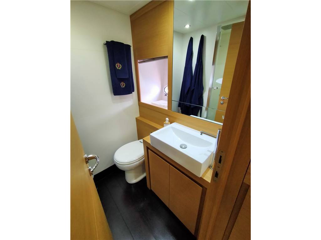 Cabina armatore a centro barca con letto matrimoniale, bagno con box doccia con calpestio in mosaico, Armadio e divanetto