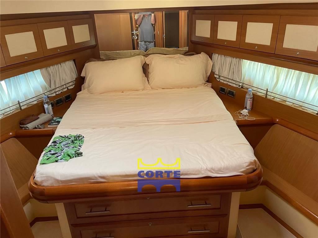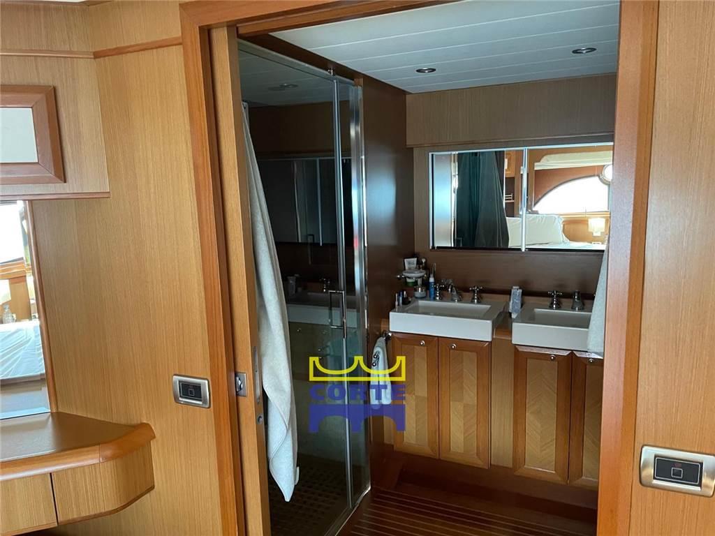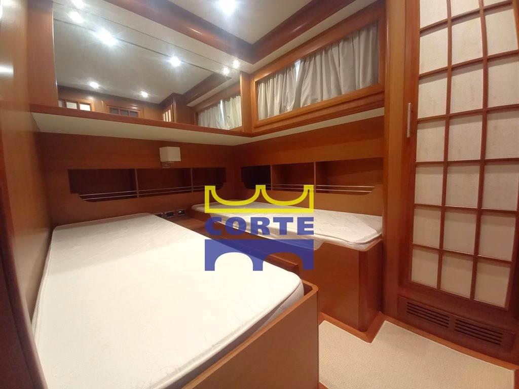 SALONE :Aria condizionata,Finestratura basculante poppiera in cristallo e telaio in acciaio inox,Mobili con ante, ripiani e cassettiera,Piano di calpestio in teak rigato acero,Salotto (divano in pelle ad L, tavolino da fumo in teak, Sistema Home Cinema Bose 3.2.1 GSII (altoparlanti (2), subwoofer, altoparlanti (2)in pozzetto)Tendine veneziane in legno (finestrature laterali, finestratura basculante poppiera)TV LCD 26" ZONA PRANZO :Aria condizionata, Divano in pelle ad L, Mobili con ante e ripiani Piano di calpestio in teak rigato acero Porta scorrevole poppiera in cristallo e telaio in acciaio inox, Sedie in pelle (3),Tavolo pranzo in teak, Tendine veneziane in legno (finestrature laterali, zona poppiera),Piano di calpestio in moquette, Prese (TV, 230V)Ripiani, Sinto lettore CD (+2 altoparlanti),Tende arricciate, Testaletto in tessuto, Vano porta oggetti (testaletto), Vetrata a scafo (oblò apribile in acciaio inox, CUCINA : Aria condizionata,Aspiratore piano cottura, Copertura ribaltabile in teak per lavello e piano cottura, Finestratura laterale con apertura basculante, Forno elettrico e microonde combinato, Frigorifero 218 lt 230V (24V tramite inverter), Lavastoviglie 6 coperti, Lavello in acciaio inox con acqua dolce calda/fredda e salata, rubinetto abbattibile, Mobili con ante, ripiani e cassettiera, Piano cottura in vetroceramica 4 fuochi con fermapentole, Piano di calpestio in teak rigato acero, Piano di lavoro in quarzo/resina, Quadro elettrico cucina, Servizio da tavola in porcellana per 8 persone, bicchieri, posate in acciaio inox, PLANCIA : Aria condizionata, Bussola magnetica, Chartplotter Raymarine con display 12Ó a colori e GPS, Contacatena elettronico digitale, Display MAN per monitoraggio dati barca, Divanetto comandante in pelle due posti ribaltabile con vano porta oggetti/carte, Leve gas-invertitore elettroniche con funzione easy-dock e autotroll, Orologio, barometro e igrotermometro, Parallelo batterie istantaneo, Piano di calpestio in teak rigato acero, Presa 12V tipo accendisigari, Radar 48 miglia con display LCD 12", Ruota timone in acciaio inox e teak veriniciato, Stazione di governo principale con strumentazione completa, Strumento di navigazione multifunzione Raymarine ST70 (Bussola, Eco, Log)Tergilavacristalli (2) con temporizzatore, Tettuccio in vetroresina apribile elettricamente, Timoneria elettroidraulica servoassistita, Unità di controllo autopilota Raymarine ST70, VHF ricetrasmittente, CORRIDOIO CABINE : Armadietto con anta e ripiano, Gavone con cambusa sottostante il pagliolo, Piano di calpestio in teak rigato acero, Ripostiglio sottoscala accesso cabina Armatore, Scala in teak rivestita in moquette, luci di cortesia e tientibene in acciaio inox, Surgelatore 67 lt 230V (24V tramite inverter) CABINA ARMATORE : Aerazione sotto il materasso, Armadietti pensili ad angolo (4),Cabina armadio (appendiabiti, ripiani, cassetta di sicurezza digitale), Comodino con anta e ripiano, Divanetto in pelle, Lampade di lettura (2,)Letto matrimoniale (doghe in legno, materasso, guanciali, copriletto), Mobile con anta e ripiani, Mobile vanity (cassetto, specchio, pouf in pelle), Piano di calpestio in moquette, Prese (TV, 230V), Ripiani, Sintolettore CD (+2 altoparlanti), Tende arricciate, Testaletto in tessuto, Vano porta oggetti (testaletto),Vetrata a scafo (oblò apribile in acciaio inox),BAGNO ARMATORE : Armadietti con specchi scorrevoli (2) e ripiani, Doccia (porta in cristallo, pareti e panchetta in mosaico con finiture in teak,carabottino in teak massello, tendina a rullo impermeabile),Lavandini (2) con acqua dolce calda/fredda e mobiletti sottostanti, Pannello gestione WC con indicazione livello cassa acque nere, Piano di calpestio in teak rigato acero, Porta scorrevole in vetro acidato, Ripiani, Servizi separati (porta in cristallo satinato, WC elettrico in ceramica ad acqua dolce,bidet in ceramica con acqua dolce calda/fredda, aspiratore)Tendine veneziane in legno, Vetrata a scafo (oblò apribile in acciaio inox), CABINA VIP : Aerazione sotto il materasso, Armadi (2) (appendiabiti), Armadietti con ante e ripiani, Cassetti (2) sotto il letto, Gavone sotto il letto, Letto matrimoniale (doghe in legno, materasso, guanciali, copriletto), Osteriggio con oscuramento, Piano di calpestio in moquette, Prese (TV, 230V)Ripiani, Specchio, Tende arricciate, Testaletto imbottita, Vetrate a scafo (2),BAGNO VIP : Armadietti con ante e ripiani, Doccia (porta scorrevole, carabottino in teak massello, panchetta in teak)Lavandino con acqua dolce calda/fredda e mobiletto portabiancheria sottostante, Oblò in acciaio inox apribile, Pannello gestione WC con indicazione livello cassa acque nere,Piano di calpestio in teak rigato acero, Specchi, Tendine veneziane in legno, WC elettrico in ceramica ad acqua dolce con bidet incorporato ad acqua dolce calda/fredda, CABINA OSPITI : Aerazione sotto il materasso, Armadio (appendiabiti), Cassetti sotto i letti (2), Comodino con cassetti, Finestratura laterale fissa con oblò (2) apribili, Lampada di lettura, Letti (2) (materassi, guanciali, copriletti)Libreria, Piano di calpestio in moquette, Ripiani, Specchio, Tende arricciate, BAGNO OSPITI : Armadietti con ante e ripiani, Doccia (porta scorrevole, carabottino in teak massello), Lavandino con acqua dolce calda/fredda e mobiletto portabiancheria sottostante Oblò in acciaio inox apribile, Pannello gestione WC con indicazione livello cassa acque nere,Piano di calpestio in teak rigato acero, Specchi, Tendine veneziane in legno, WC elettrico in ceramica ad acqua dolce con bidet incorporato ad acqua dolce calda/fredda, DISIMPEGNO CABINA EQUIPAGGIO : Accesso al ponte principale (porta scorrevole in vetroresina, scala in vetroresina e teak), Armadio (appendiabiti), Letto (materasso, guanciale, copriletto, tendina di separazione), Mobile attrezzato con lavasciuga e vano portabiancheria, Piano di calpestio in moquette, Quadro elettrico principale, Tiranti di emergenza locale motori (interruzione gasolio m