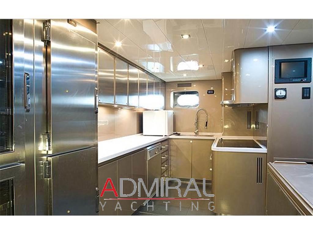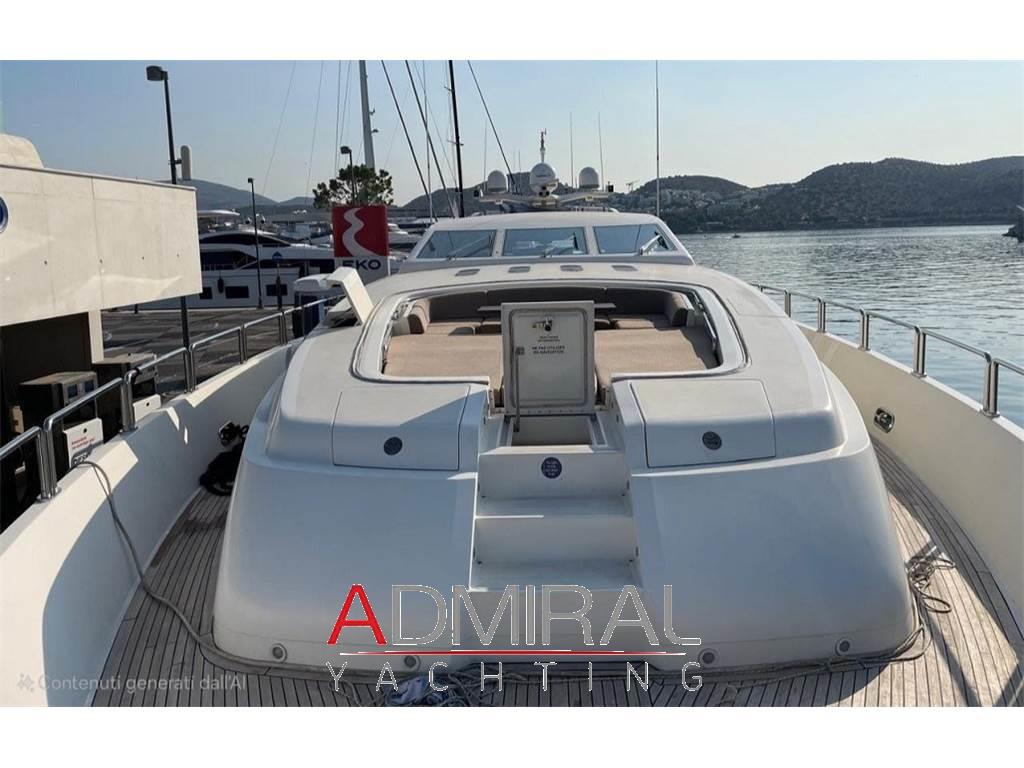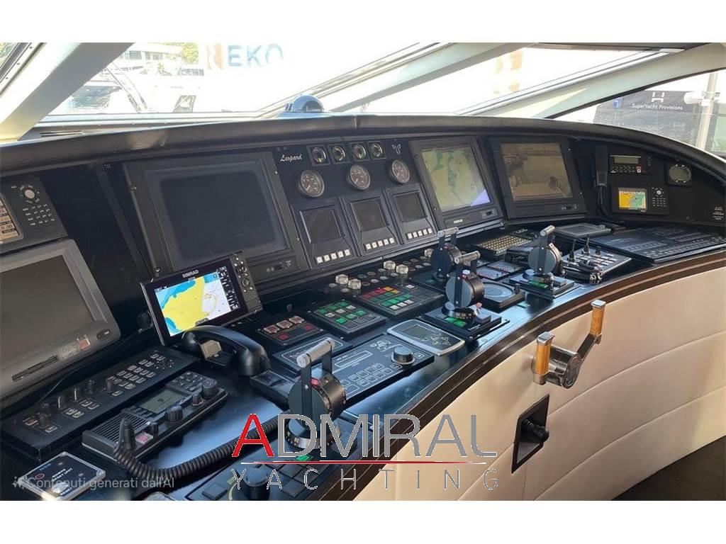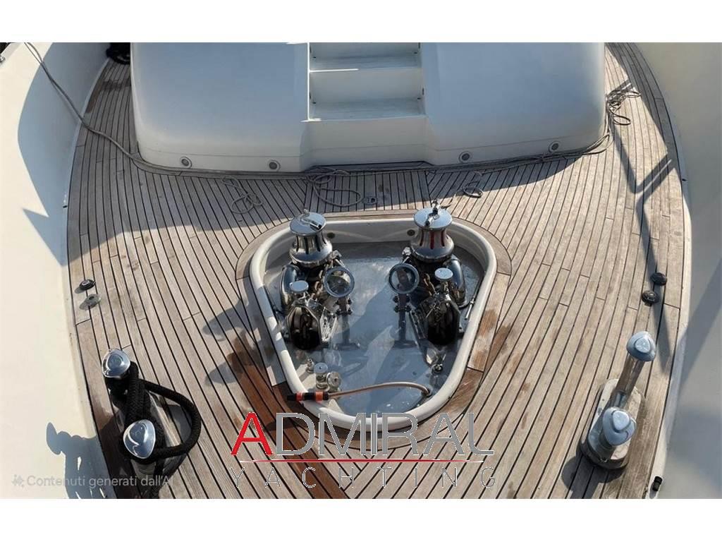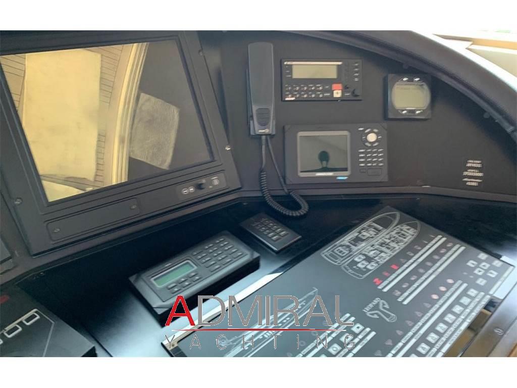 Allarme fumo/gas, Allarme motore, Allarme sentina, Altoparlanti, Ancora, Angolo barra, Aria condizionata, Autoclave, Auto-Trim, Batterie, Boiler, Camminamenti laterali in teak, Caricabatterie, Clima reversibile, Collegamento internet, Congelatore, Controllo Domotica, Cucina, Cuscineria completa, Cuscineria di poppa, Cuscineria di prua, Cuscineria Pozzetto, Dimmer per Luci, Dissalatore, Doccia esterna, Elica di poppa - stern thruster, Elica di prua - bow thruster, Faro orientabile, Flap idraulici, Forno, Frigorifero esterno, Frigorifero interno, Garage per tender, Gruette per moto d'acqua, Gruette per tender, Hard top, Home Theater (Home Cinema with 60" 3D Screen), ICE Maker, Impianto acque nere, Impianto antincendio, Impianto TV, Indicatori Flaps, Inverter, Lavandino nel Pozzetto, Lavasciuga, Lavastoviglie, Luci di cortesia, Macchina caffè, Moto d'acqua (Seadoo 155 Hp), Passerella (idraulica), Pavimento interno in legno, Piastra in vetroceramica, Piattaforma, Pompa di sentina automatica, Pompa di sentina manuale, Ponte in teak, Porta ingresso, 2 Porta laterale, Pozzetto Teak, Presa 220V banchina, Presa acqua banchina, Prese interne 12v, Prese interne 220v, Radio AM/FM, Riscaldamento, Salpa Ancore Elettrico, Scaletta da bagno, Serbatoio Acque Nere, Stereo (B&O surround sound stereo system), Tavolo pozzetto, Tavolo Salone Abbattibile, Teli copri finestra, Tender, Tromba, 6 TV (salone, home cinema e nelle cabine), 8 WC marino elettrico, 2 Winch tonneggio di poppa, Winecooler