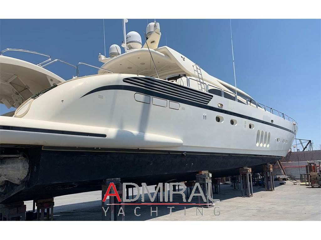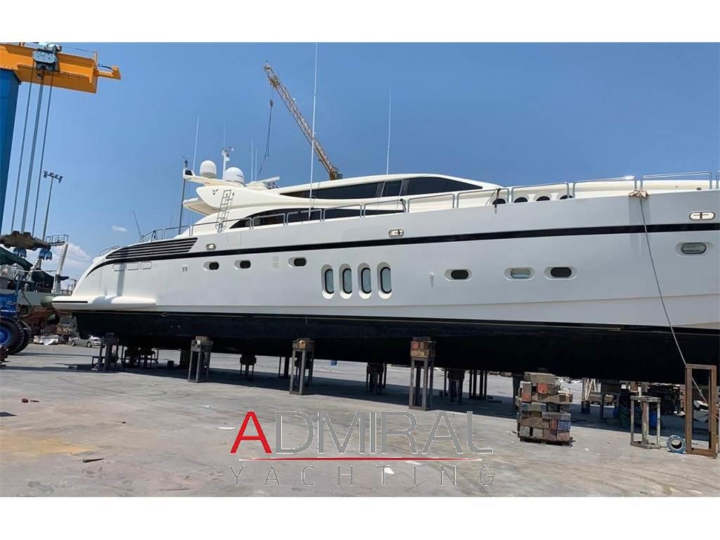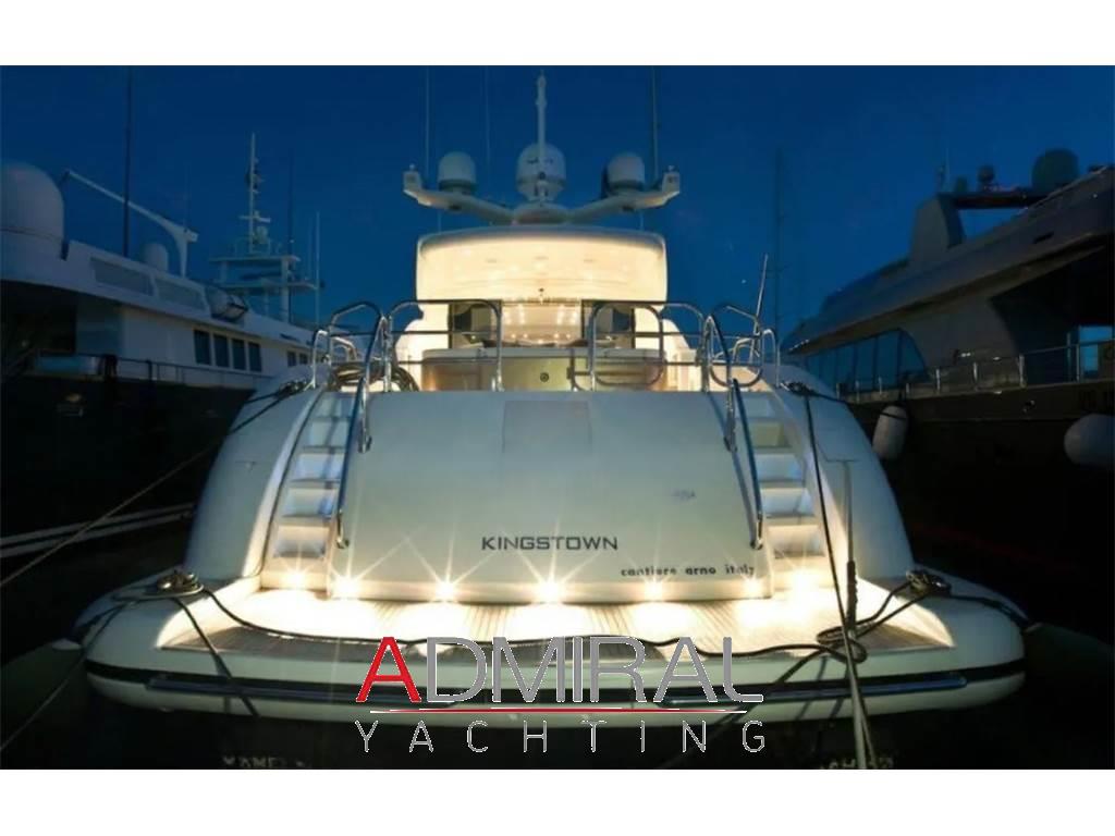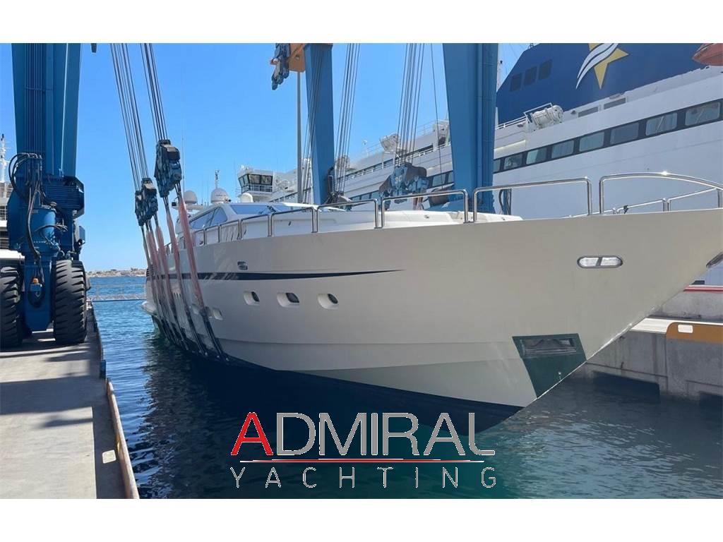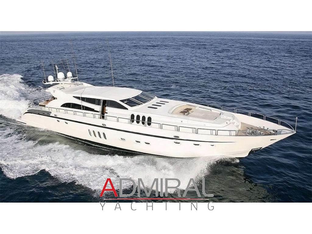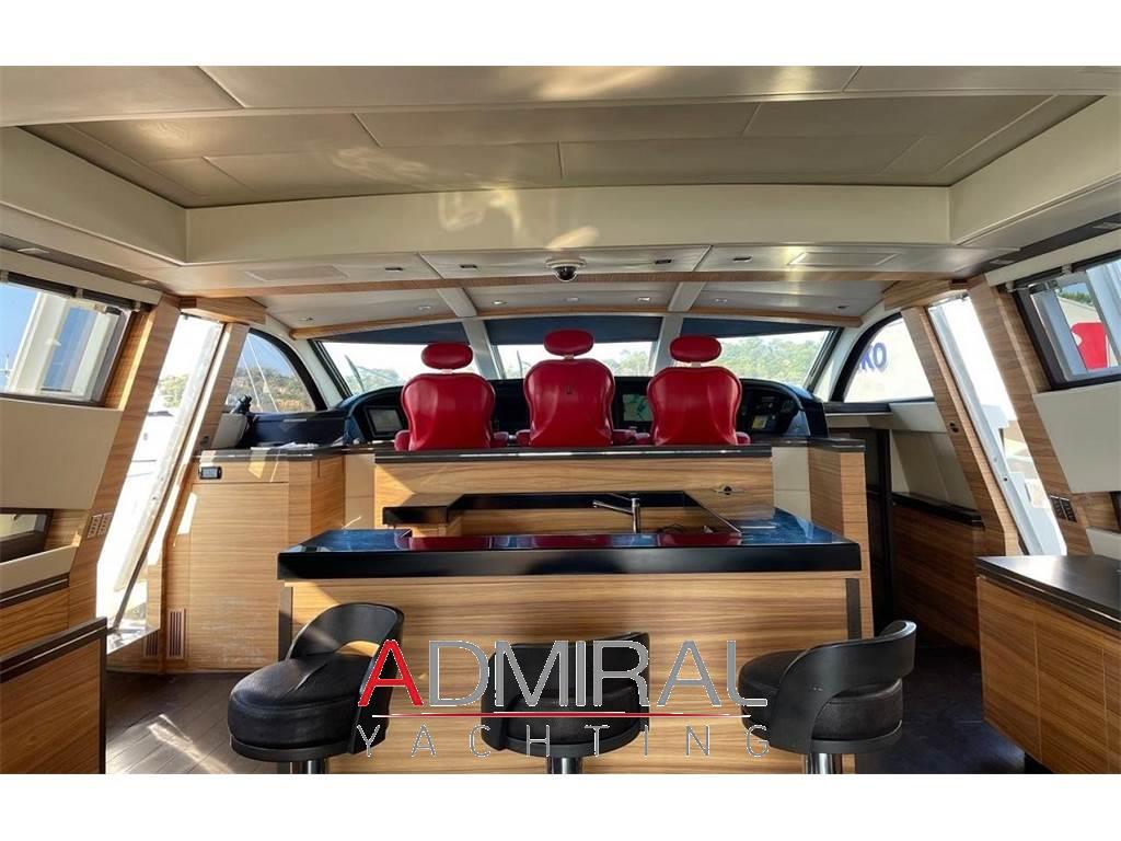 Allarme fumo/gas, Allarme motore, Allarme sentina, Altoparlanti, Ancora, Angolo barra, Aria condizionata, Autoclave, Auto-Trim, Batterie, Boiler, Camminamenti laterali in teak, Caricabatterie, Clima reversibile, Collegamento internet, Congelatore, Controllo Domotica, Cucina, Cuscineria completa, Cuscineria di poppa, Cuscineria di prua, Cuscineria Pozzetto, Dimmer per Luci, Dissalatore, Doccia esterna, Elica di poppa - stern thruster, Elica di prua - bow thruster, Faro orientabile, Flap idraulici, Forno, Frigorifero esterno, Frigorifero interno, Garage per tender, Gruette per moto d'acqua, Gruette per tender, Hard top, Home Theater (Home Cinema with 60" 3D Screen), ICE Maker, Impianto acque nere, Impianto antincendio, Impianto TV, Indicatori Flaps, Inverter, Lavandino nel Pozzetto, Lavasciuga, Lavastoviglie, Luci di cortesia, Macchina caffè, Moto d'acqua (Seadoo 155 Hp), Passerella (idraulica), Pavimento interno in legno, Piastra in vetroceramica, Piattaforma, Pompa di sentina automatica, Pompa di sentina manuale, Ponte in teak, Porta ingresso, 2 Porta laterale, Pozzetto Teak, Presa 220V banchina, Presa acqua banchina, Prese interne 12v, Prese interne 220v, Radio AM/FM, Riscaldamento, Salpa Ancore Elettrico, Scaletta da bagno, Serbatoio Acque Nere, Stereo (B&O surround sound stereo system), Tavolo pozzetto, Tavolo Salone Abbattibile, Teli copri finestra, Tender, Tromba, 6 TV (salone, home cinema e nelle cabine), 8 WC marino elettrico, 2 Winch tonneggio di poppa, Winecooler