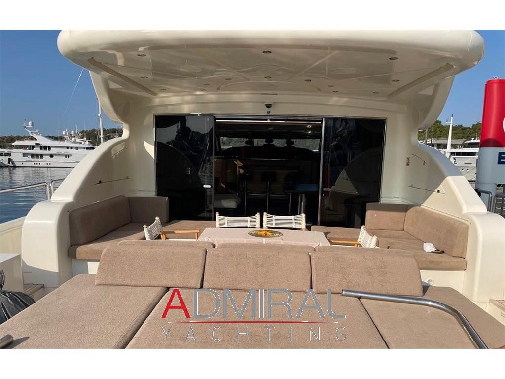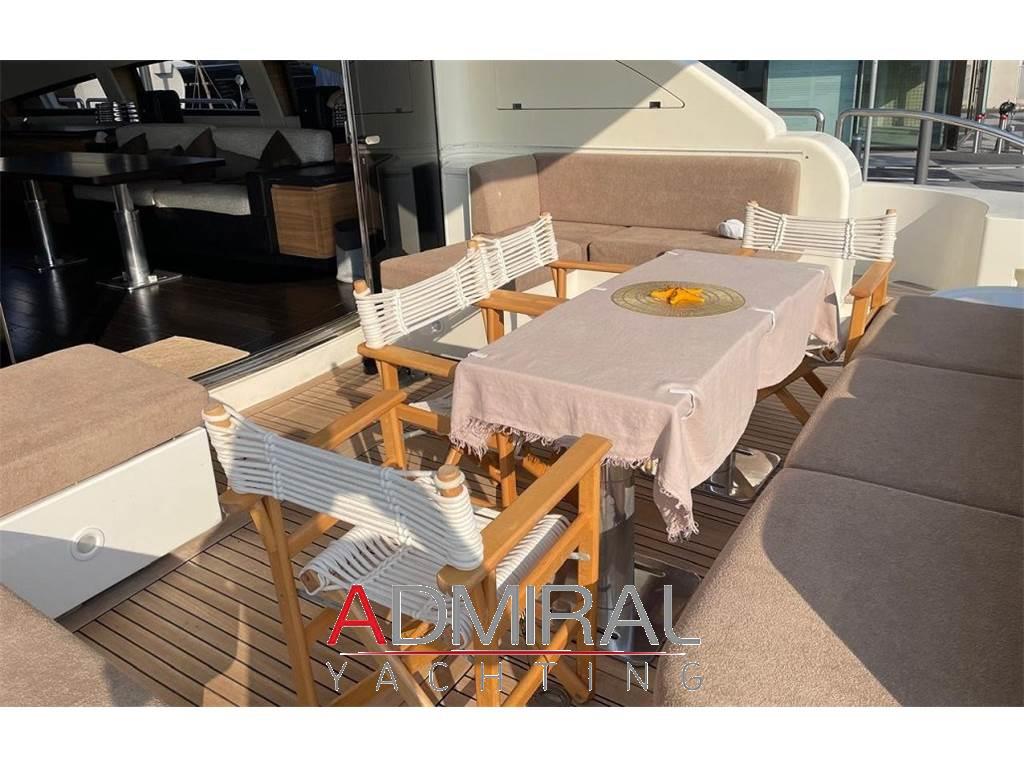 Antistante l'ingresso al salone principale sono presenti divani angolari su entrambi i lati con due tavolini e un divano che si unisce ad un ampio prendisole lungo la poppa. Una scala su entrambi i lati conduce alla piattaforma da bagno del ponte inferiore. Camminamenti laterali conducono lungo il ponte principale fino al ponte di prua, dove si trova un altro divano a C con due tavolini ed ampi lettini prendisole