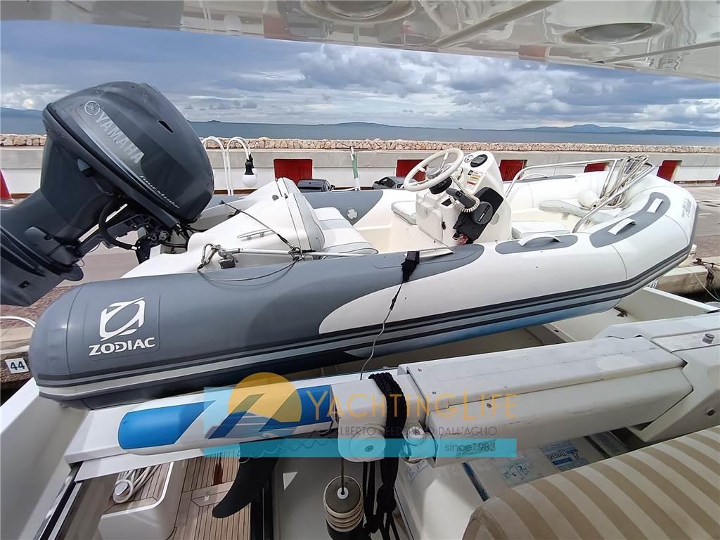 Allarme motore, Allarme sentina, Ancora, Angolo barra, Antenna radar, Autoclave, Autogonfiabile, Batterie, Bussola, Camminamenti laterali in teak, 2 Caricabatterie, Contamiglia, Doccia esterna, Doppia timoneria, Ecoscandaglio, Elica di poppa - stern thruster, Elica di prua - bow thruster, Flap idraulici, GPS, Gruette per tender su fly, Impianto antincendio, Indicatori Flaps, Interfono, Lavaggio catena, Luci di cortesia, Passerella (idraulica), Piattaforma, Pilota automatico, Plotter, Pompa di sentina automatica, Pompa di sentina manuale, Porta ingresso, Porta laterale, Pozzetto Teak, Presa 220V banchina, Radar, Raddrizzatore, Radio VHF, Salpa Ancore Elettrico, Scaletta da bagno, SSB, Tavolo pozzetto, Tender (e motore 40hp), Tromba, 2 Winch tonneggio di poppa, Winch tonneggio di prua