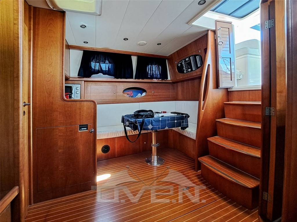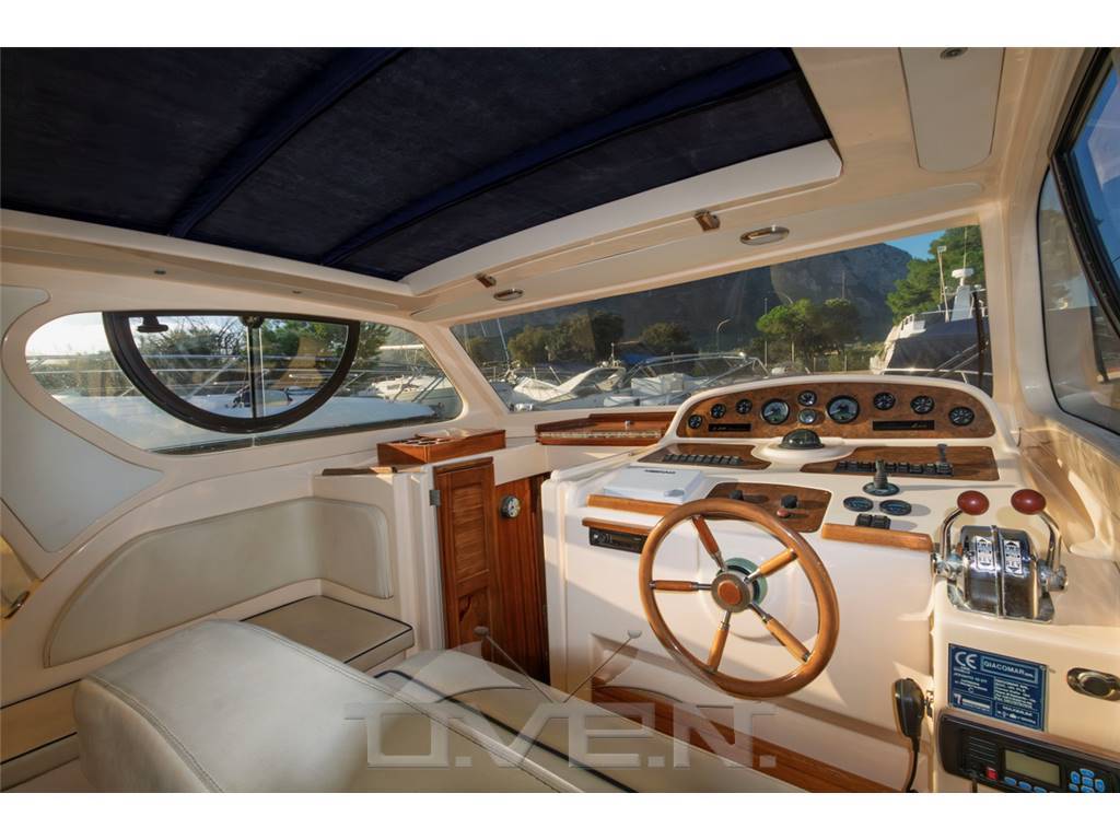 Descrizione interni: la barca dispone internamente di una cabina matrimoniale, di una dinette con due divani trasformabili, cucina interna a induzione, più cucina a gas esterna completa di lavello, frigorifero interno, televisore, bagno con doccia e wc elettrico.