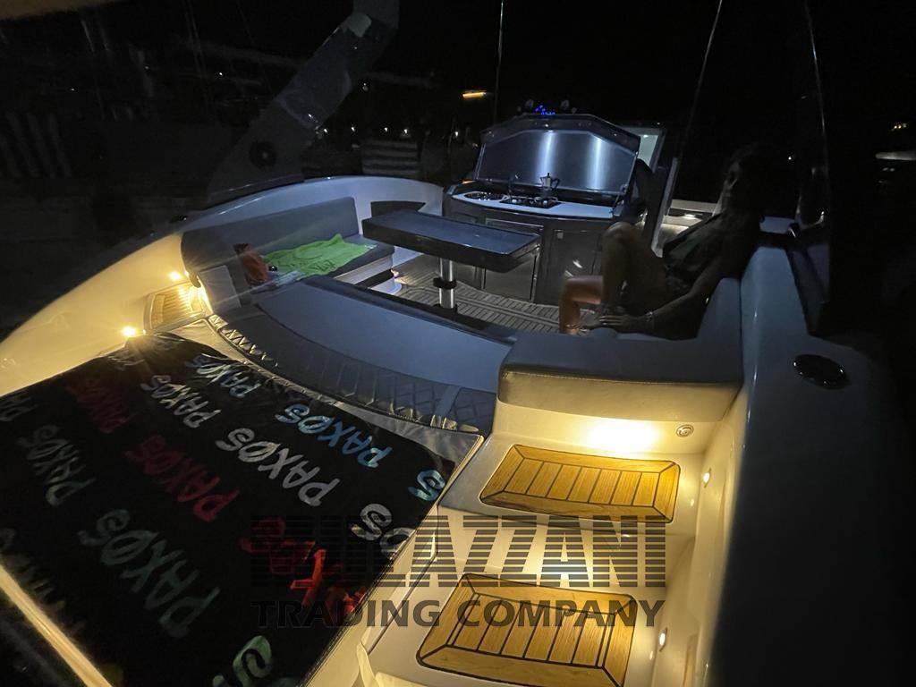 Allarme motore, Ancora, Apertura Vano Motore Elettrica, 3 Batterie (150ah), Bussola, Camminamenti laterali in teak, Caricabatterie, Contamiglia, Display, Doccia esterna, Ecoscandaglio (Garmin), GPS (Garmin touch screen), Lavandino nel Pozzetto, Luci di cortesia, Piattaforma (teack), Pilota automatico (Garmin), Plotter con antenna GPS, Pompa di sentina automatica, Pompa di sentina manuale, Pozzetto Teak, Presa 220V banchina, Rollbar, Salpa Ancore Elettrico (con telecomando), Scaletta da bagno, Tavolo, Tromba
