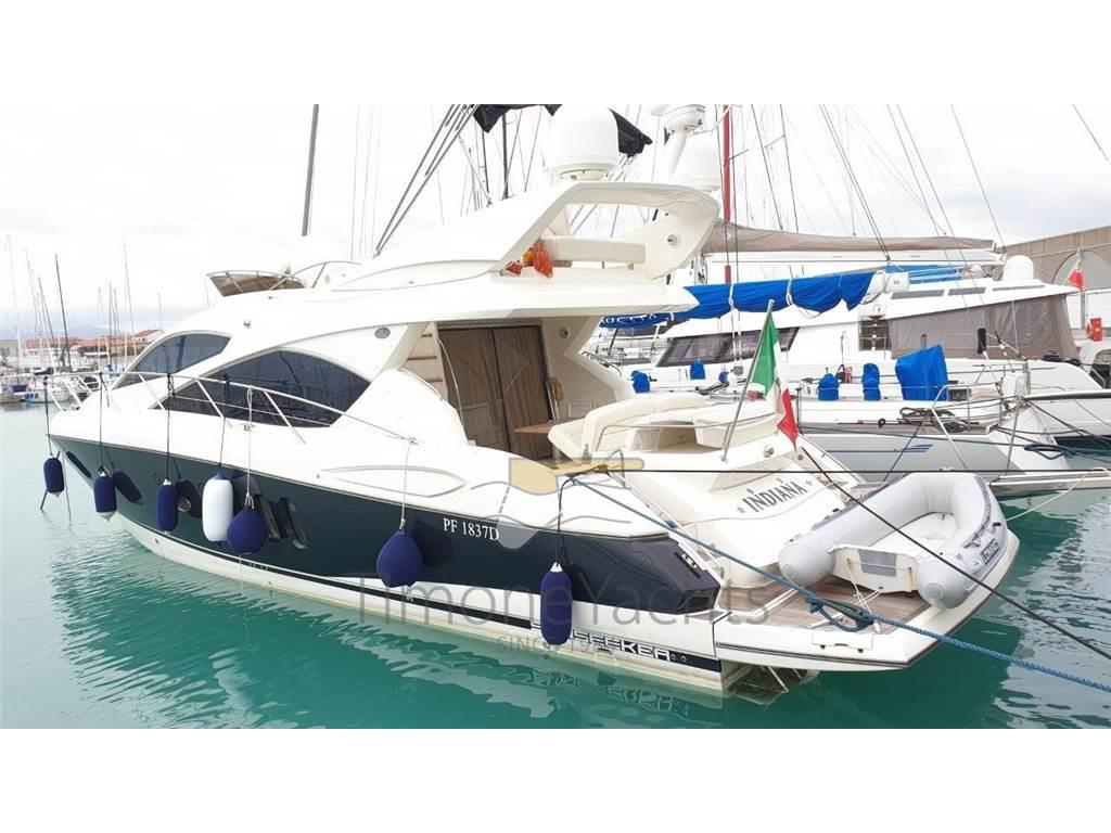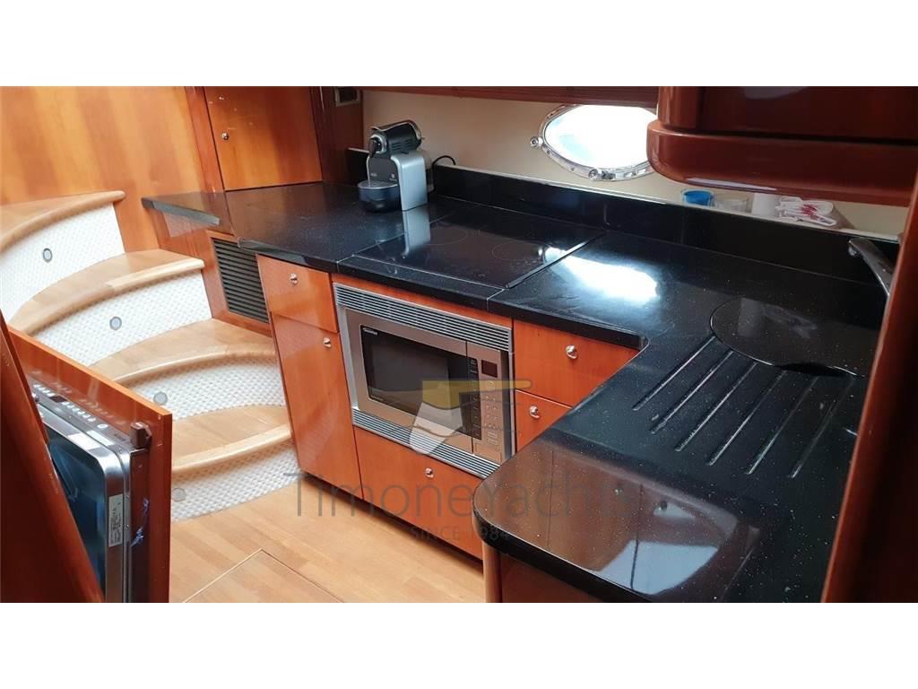 Dotazioni principali: aria condizionata, generatore 11 kW, elica di prua e poppa, piattaforma idraulica, GPS, radar, autopilota, sistema TV satellitare, impianto audio, pozzetto e piattaforma bagno in teak. Flybridge attrezzato con frigorifero, grill, tavolo, bimini top e cuscinerie prendisole. Altre caratteristiche: passerella idraulica, serbatoio acque nere e grigie, verricello elettrico, zanzariere e scafo blu scuro