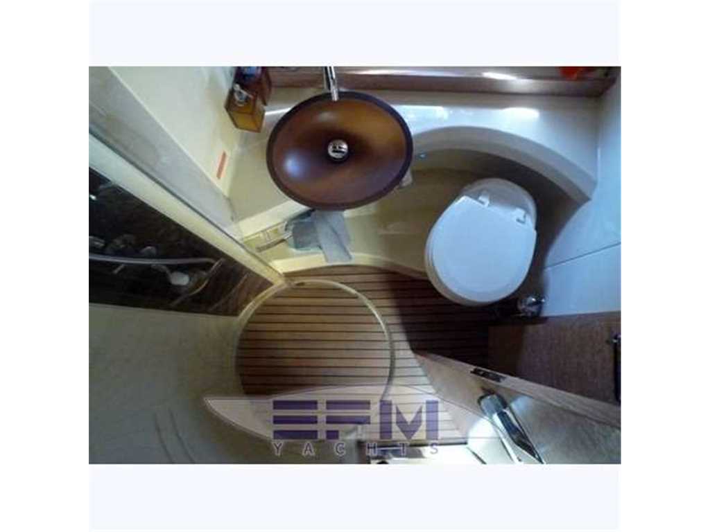 Cabina armatore a prua, con letto matrimoniale, testa letto in tessuto, giro letto in pelle, luci lettura Led, oblò apribili, armadio appendiabiti, gavone sotto letto con doppio accesso. Il bagno ha pavimento in teak, lavabo in "vetro freddo" (resina trasparente), vano con specchiera scorrevole, box doccia separato tondo con faro integrato e lucernario verso il main deck, wc marino elettrico con maceratore.