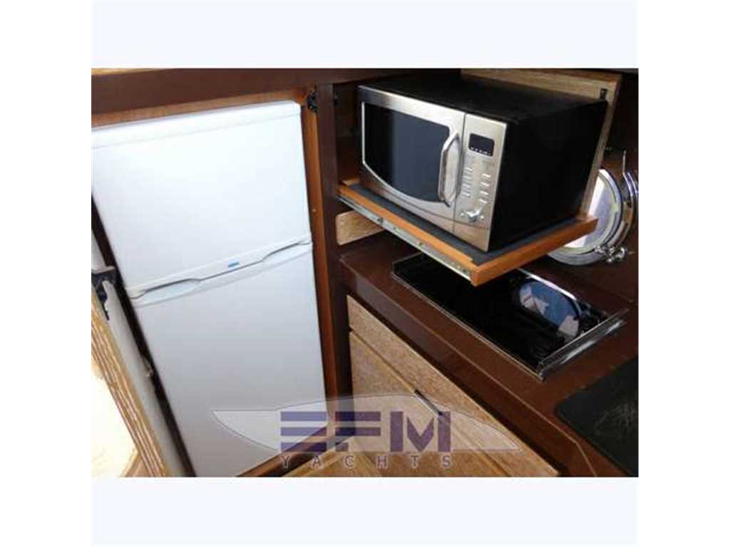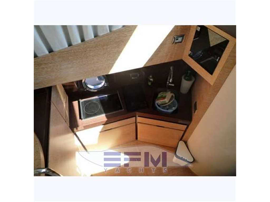 Azimut 38 Fly La cucina, in fondo alla scala di accesso al sottocoperta, è dotata di pavimento in rovere, piano in resina (derivato dai modelli maggiori), lavello inox con mixer e acqua pre-termostatata, microonde, frigo/freezer da 130 litri, armadietti, cassetti a chiusura frazionata dedicati a posate ecc., oblò apribile. Nel salone, sulla dritta, un divano a L è opzionalmente trasformabile in letto e con il tavolo apribile in legno/cristallo, trasportabile all'esterno quando necessita, rappresenta la dinette/living; contrapposto troviamo un mobile con vani dedicati per il vasellame e altro, l'uscita dell'aria condizionata e lo spazio per il TV esterno.