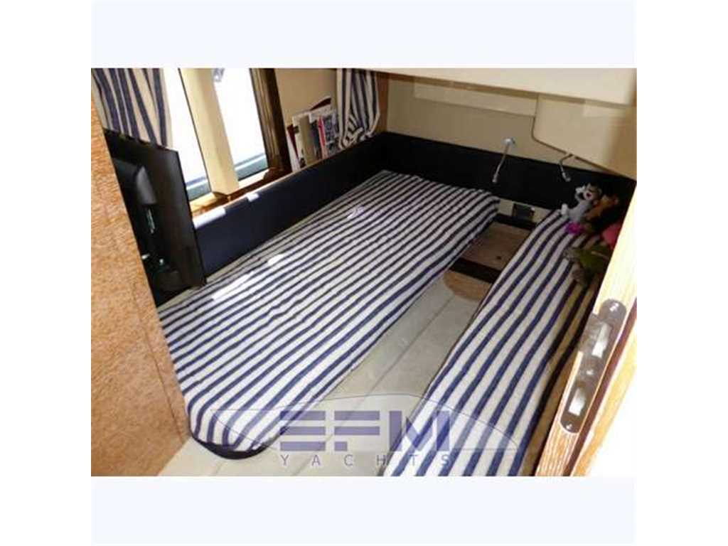 Azimut 38 Fly La cabina ospiti di dritta con letti gemelli ha una open view bipartita con cristallo composito da 14 mm e un oblò apribile, armadio appendiabiti con interno in cedro, comodino con ripostiglio, cassetto e gavone di stivaggio a pavimento, Il bagno, simile a quello armatoriale come dotazione, ha un calpestio più ampio e manca il lucernario; è comunque presente un oblò apribile. Un portello a pagliolo nel disimpegno permette una facile ispezione o sostituzione della vasca acque grigie dove, per gravità, vengono convogliate le acque di risulta.