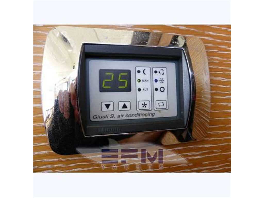Posto di pilotaggio: in postazione rialzata sulla dritta del salone, con finestratura apribile lateralmente e piccolo boccaporto verso il fly, poltrona due posti, ripostiglio, display Vessel View per il controllo dei motori Cummins (giri, pressioni, tensioni, consumi ecc.) e dei vari parametri di bordo, tridata, Raymarine C140, comandi e indicatori flap.