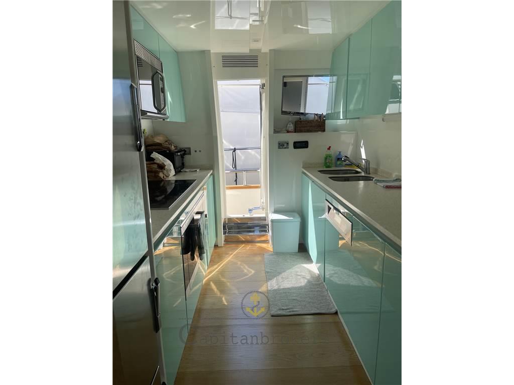 Imbarcazione in buone condizioni generali, Grandissimo salone molto spazioso con doppio divano e mobile tv, tavolo da pranzo comodo per 10 persone, cucina con porta laterale esterna.