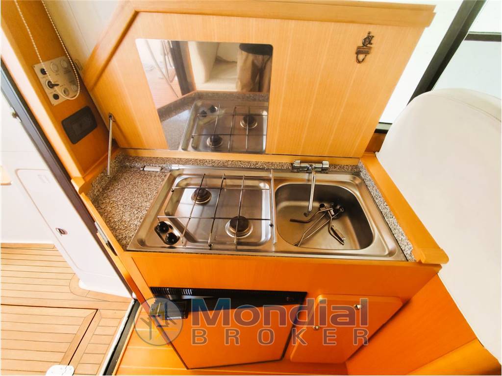 ENTRANDO DAL POZZETTO TROVIAMO IL MOBILE CUCINA A SINISTRA A SCOMPARSA CON LAVELLO INOX - FRIGORIFERO - DUE FUOCHI A GAS - DINETTE DAVANTI TIMONERIA CON TAVOLO ABBATTIBILE - SEDILE PILOTA IN PELLE -