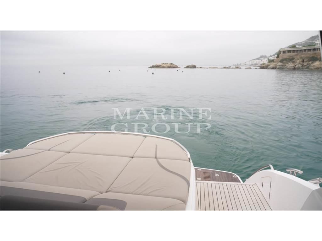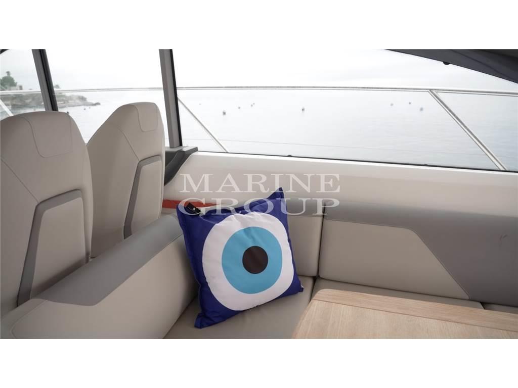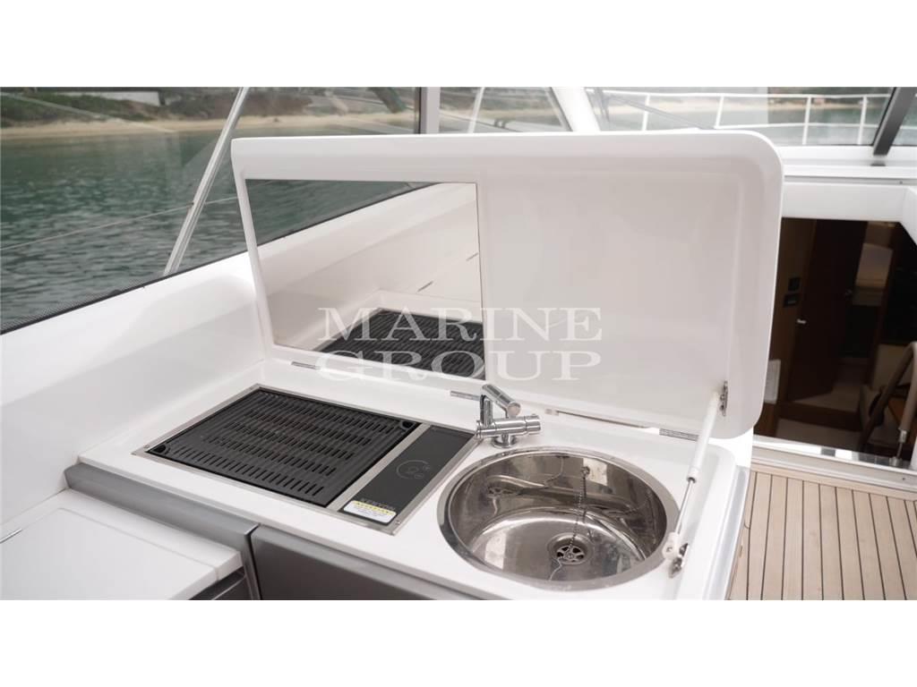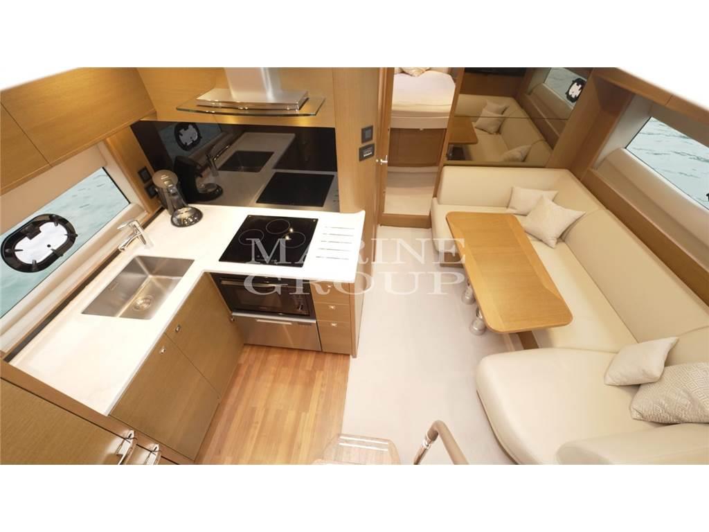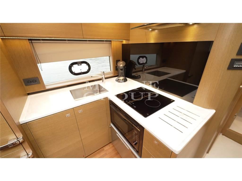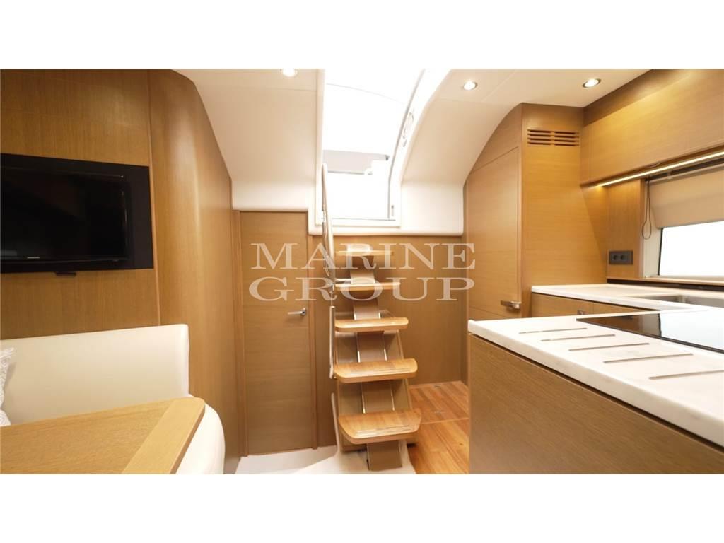 Grande pozzetto con prendisole e garage per il tender – interni in essenza di rovere chiaro e pavimento in legno in cucina - cucina equipaggiata – dinette trasformabile in letto - cabina armatoriale a centro barca con bagno ensuite – cabina VIP a prua con letto matrimoniale – bagno ospiti con doppio accesso