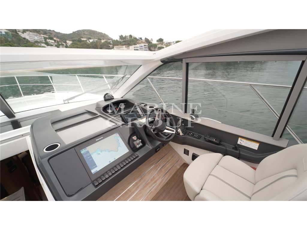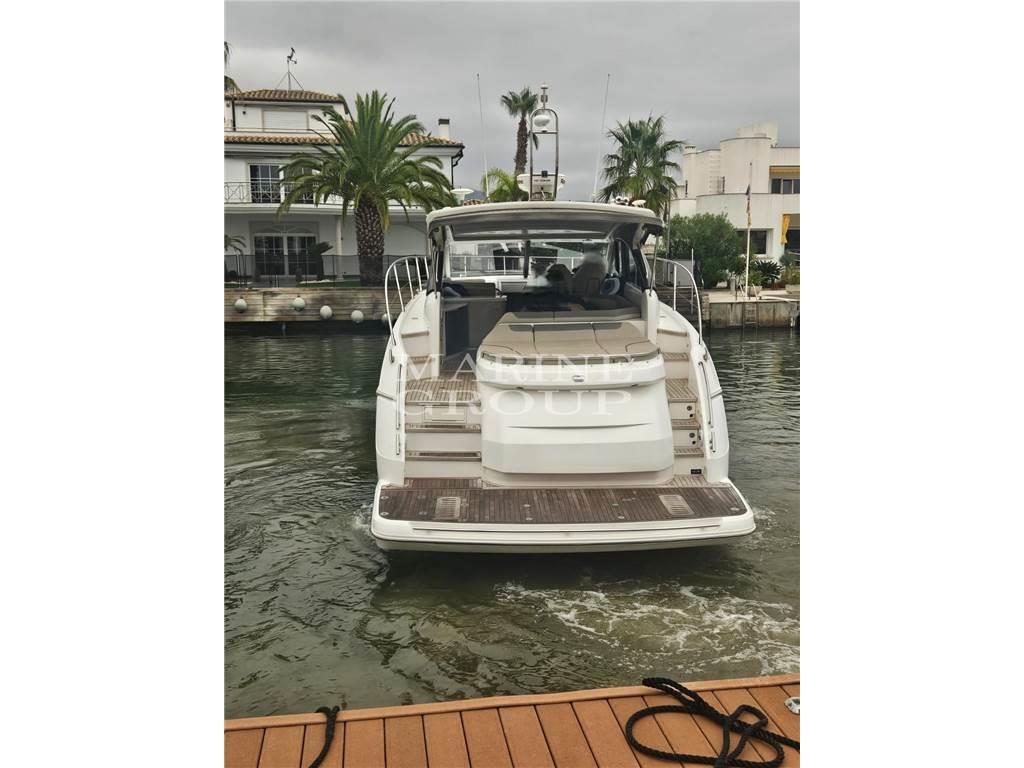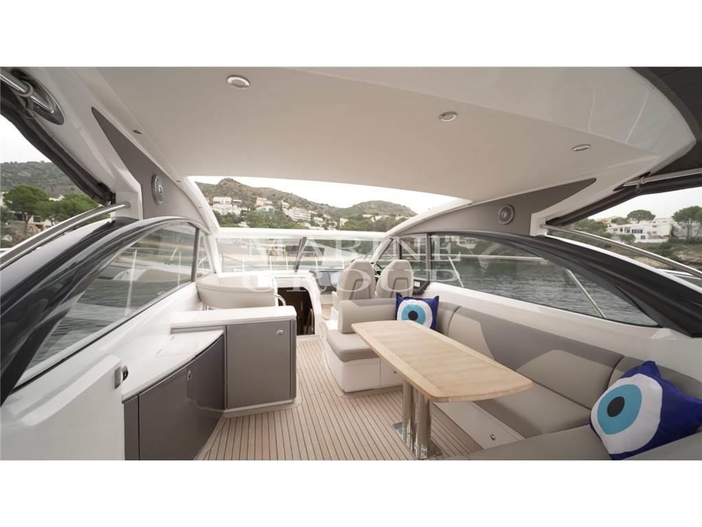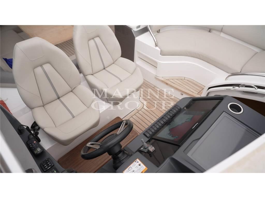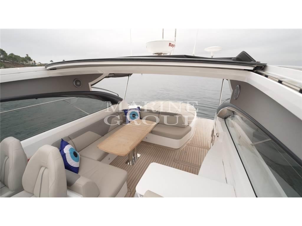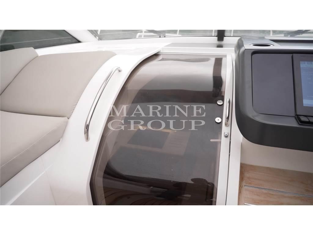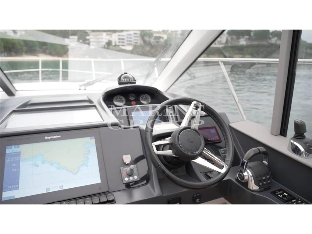 Grande pozzetto con prendisole e garage per il tender – interni in essenza di rovere chiaro e pavimento in legno in cucina - cucina equipaggiata – dinette trasformabile in letto - cabina armatoriale a centro barca con bagno ensuite – cabina VIP a prua con letto matrimoniale – bagno ospiti con doppio accesso