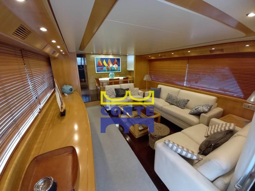Allarme motore, Allarme sentina, Ancora, Autoclave, Batterie, Bussola, Camminamenti laterali in teak, Caricabatterie, Comando motori elettronico, Computer di bordo, Contamiglia, Doccia esterna, Ecoscandaglio, Elica di poppa - stern thruster, Elica di prua - bow thruster, Flap idraulici, Gruette per tender su fly, Impianto antincendio, Interfono, Luci di cortesia, Passerella (idraulica a scomparsa), Piattaforma (di poppa in teak), Pilota automatico (Simrad), Plotter con antenna GPS (Lorenz), Pompa di sentina automatica, Pompa di sentina elettrica, Porta ingresso, Porta laterale, Pozzetto Teak, Presa 220V banchina, Presa acqua banchina, Radar (Simrad), Radio VHF, Salpa Ancore Elettrico, Scaletta da bagno, Tavolo pozzetto, Tromba, 2 Winch tonneggio di poppa, Winch tonneggio di prua
