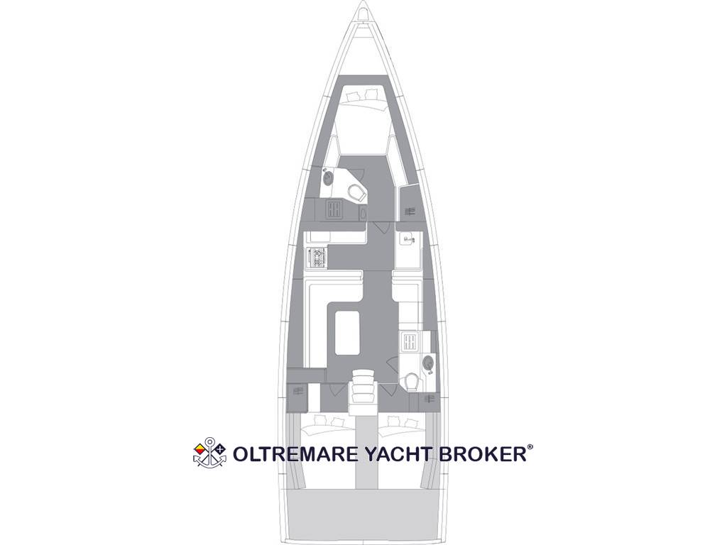 Cabina armatoriale a prua con letto a penisola e comode salite laterali, gavoni ed armadietti, oblò sulle murate fissi, due boccaporti apribili, ben areata ed illuminata