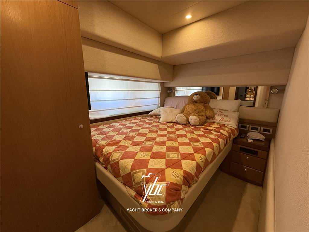 - Cabina armatoriale a centro barca, a tutto baglio, con armadi, ampi cassetti sotto il letto, chaise-longue ed accesso diretto al comodo ed ampio bagno esclusivo con wc, bidet e box doccia separato.
