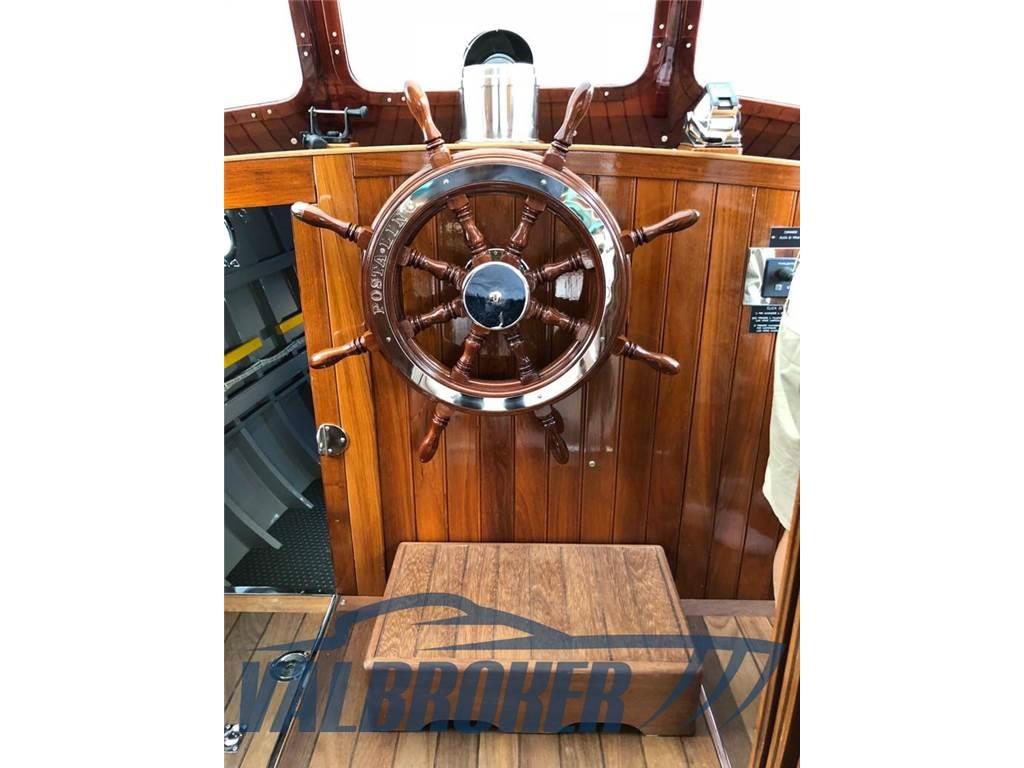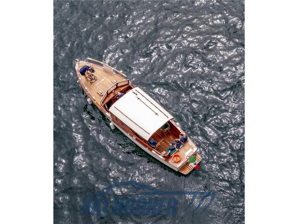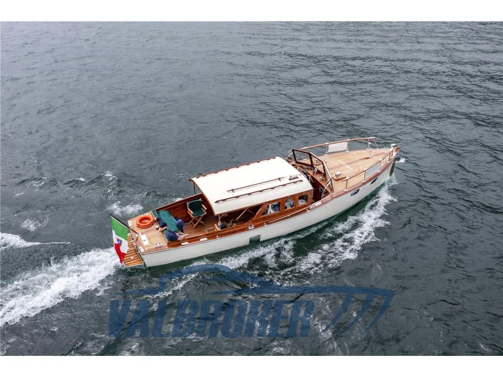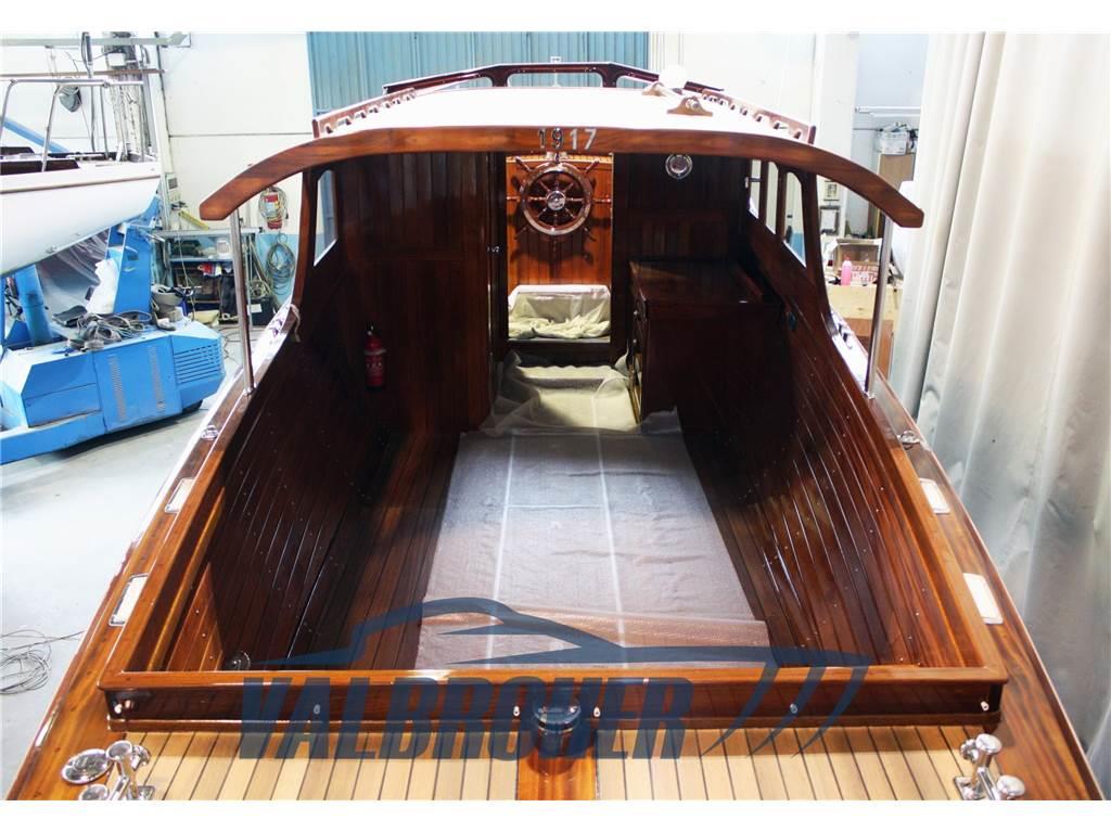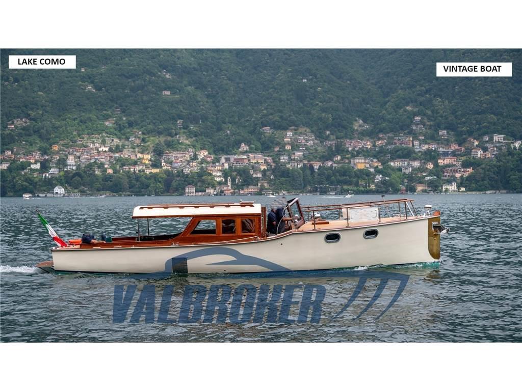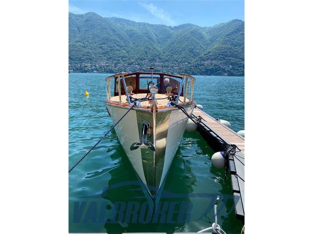 Costruita in un cantiere nautico inglese nel 1917 come barca d’appoggio per una America’s Cup in Inghilterra per poi finire in Italia. Ristrutturata dal cantiere Carolini Mario di Trieste nel 1946 e poi trasferita in Sardegna. Dopo aver avuto diversi proprietari il colpo d’occhio dell’ultimo armatore affascinato dalla stupenda prua a coltello, diede inizio ad una profonda operazione di restauro, dal 2007 al 2010, eseguito con grande maestria sul lago di Como. Per la motorizzazione è stato scelto uno Yanmar da 110 HP leggero e potente con una leva di comando elettronica della Indemar e per facilitare le manovre in banchina ed è stata installata un’elica di prora elettrica della Vetus. La strumentazione è essenziale ma completa: sonar, radio VHF, bussola in inox, faro elettrico a prora e un comodo salpa ancora. Il restauro e la ristrutturazione viaggiano di pari passo per poter fornire il fascino e la comodità ad una barca, che dopo un secolo di vita, emoziona ed entusiasma sempre, oggi come allora.A corredo una copertura su misura per tutto lo scafo e diversi tendalini per la plancia e per il locale di poppa.