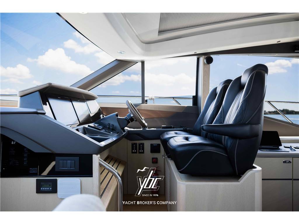 A dritta, un tavolo pranzo con divanetto completa la zona pranzo, mentre più avanti un grande divano a C guarda verso un mobile con TV da 50”. La postazione di guida, con il caratteristico finestrino elettrico Princess sia a dritta che a babordo assicura un’ottima ventilazione e un controllo totale dell’imbarcazione.