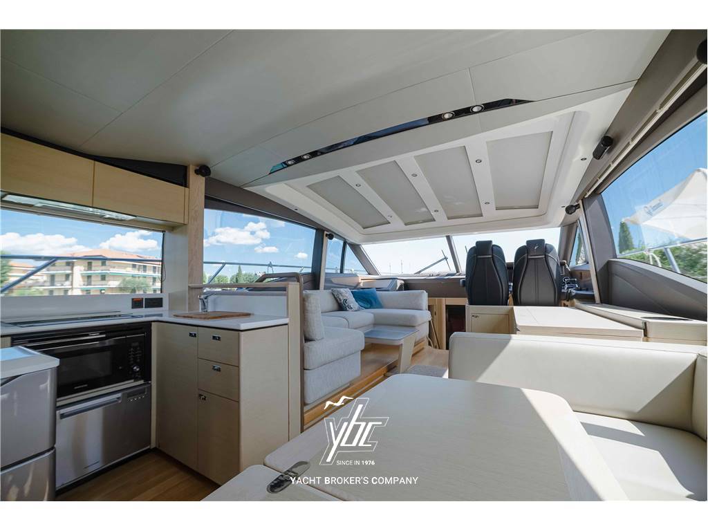 La dinette, estremamente luminosa grazie alle ampie vetrate e all’hardtop a movimentazione elettrica, si integra alla perfezione con la cucina a poppa, completa di ogni comfort e dotata di un pratico frigorifero a colonna. Una finestra apribile collega direttamente la cucina con il pozzetto, creando un ambiente unico.