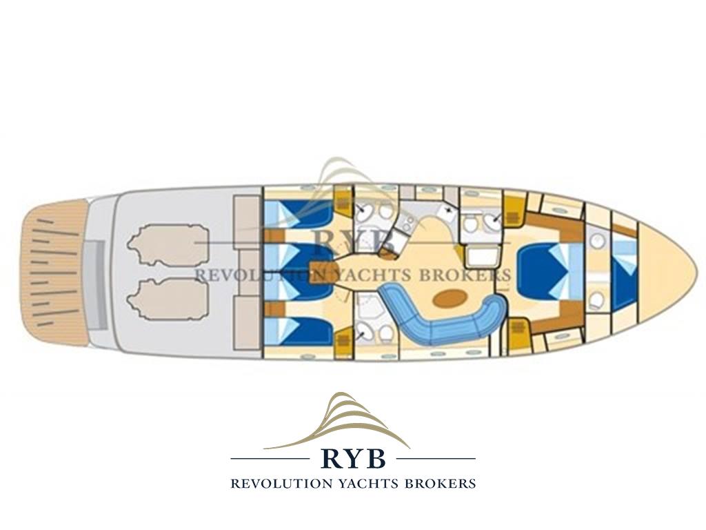 2 Doppia in piano, 1 Matrimoniale italiana, 1 Cabina equipaggio, 3 Toilette. Persone trasportabili: 16.