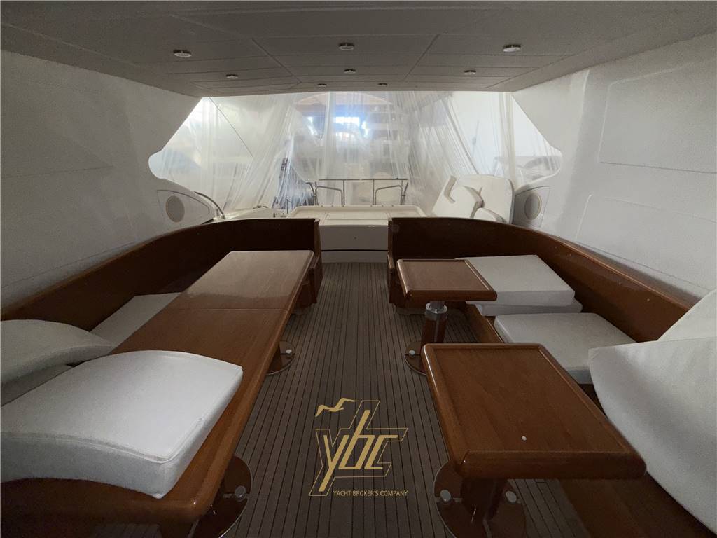 Gli esterni vantano scafo bianco e coperta in teak, con un ampio pozzetto dotato di doppi divani a "C", zona prendisole prodiera con tripla seduta e cucina esterna attrezzata. Sottocoperta si accede a un accogliente salone con grande divano a "C", tavoli, TV e ampie finestrature rettangolari che garantiscono luminosità naturale. La cucina interna, ampia e funzionale, è completa di forno e frigorifero a colonna.