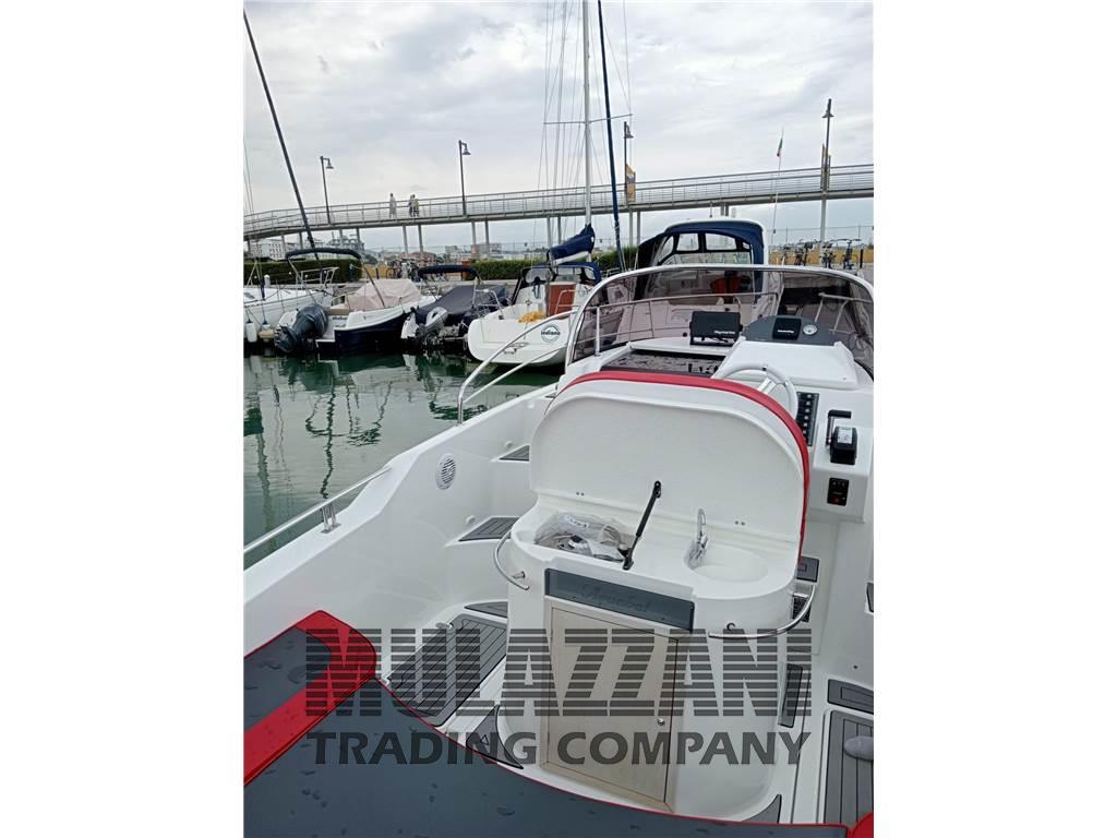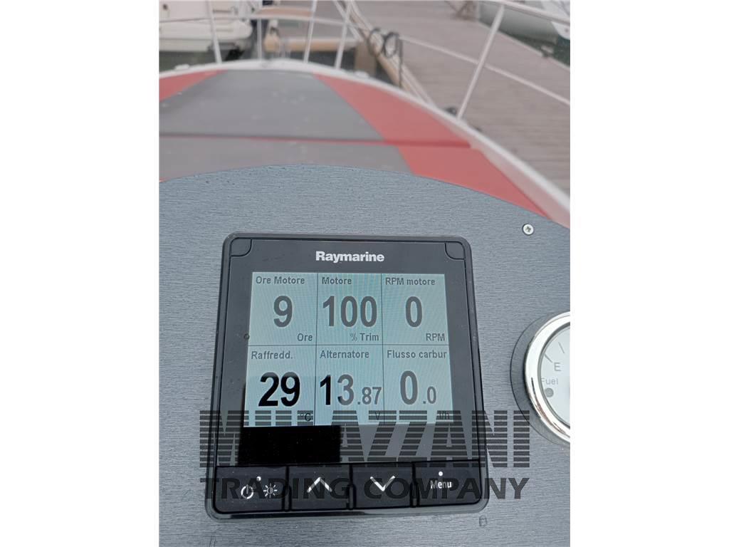 Allarme motore, Ancora, Angolo barra, Autoclave, 3 Batterie, Caricabatterie, Colorazione speciale, Comando motori elettronico, Computer di bordo, Contamiglia, Display, Doccia esterna, DSC vhf, Ecoscandaglio, Plotter con antenna GPS, Pompa di sentina automatica, Pompa di sentina elettrica, Presa 220V banchina, Radio VHF, Salpa Ancore Elettrico, Scaletta da bagno, Tavolo pozzetto