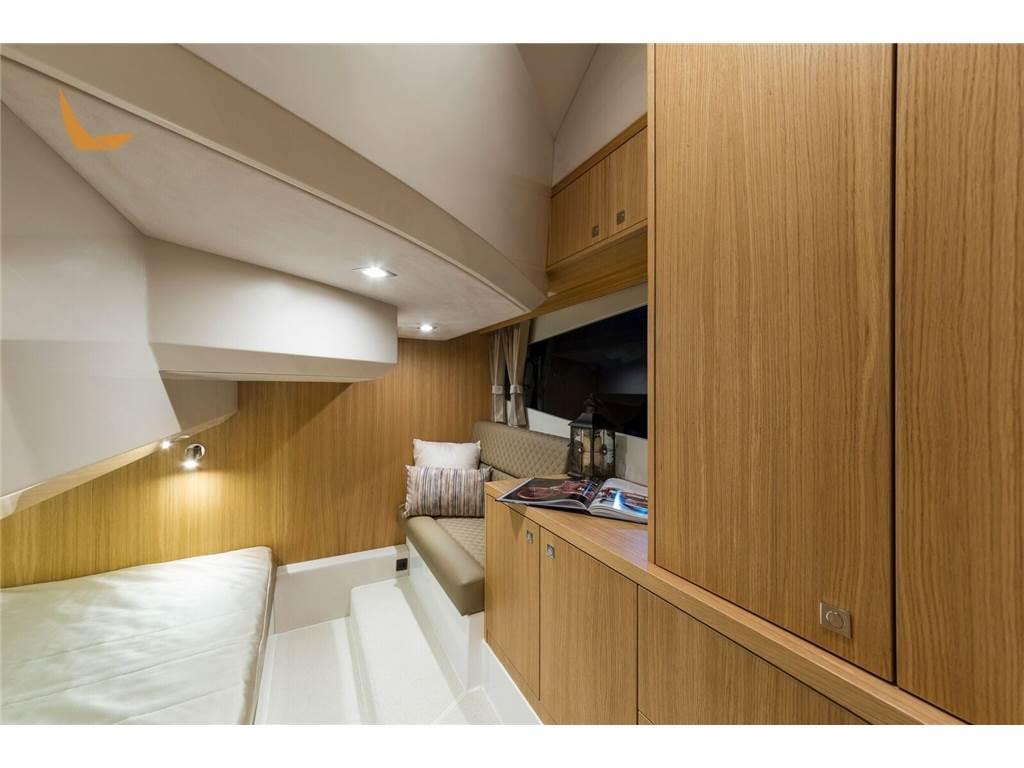 Gli interni sono personalizzabili e le prestazioni ottime. Il 370 è un natante con tre cabine (2 matrimoniali ed una con i letti a castello) ed un bagno con doccia.